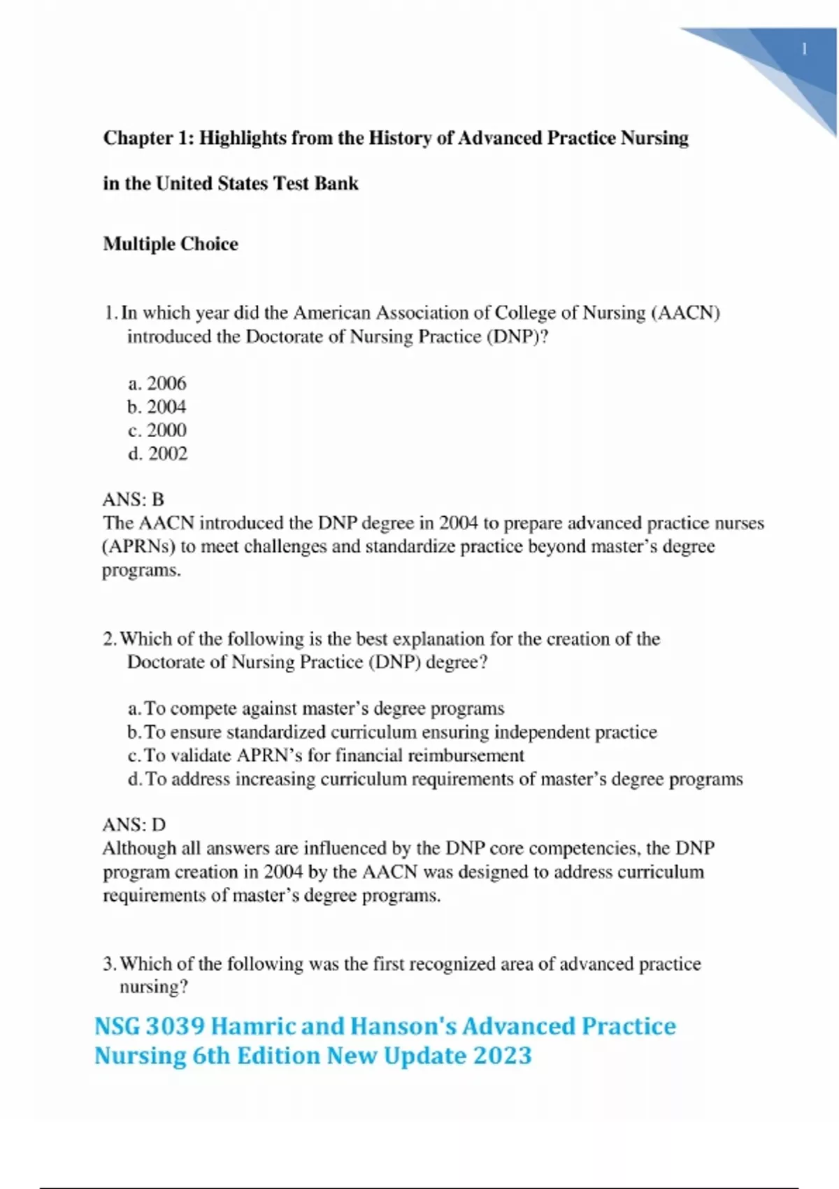 Test Bank For Hamric & Hanson's Advanced Practice Nursing 6th Edition by Mary Fran Tracy, Eileen Chapter 1-24 Complete Solutions. Chapter 1: Highlights from the History of Advanced Practice Nursing in the United States Multiple Choice 1. In which year did the American Association of College of Nursing (AACN) introduced the Doctorate of Nursing Practice (DNP)? a. 2006 b. 2004 c. 2000 d. 2002 ANS: B The AACN introduced the DNP degree in 2004 to prepare advanced practice nurses (APRNs) to meet challenges and standardize practice beyond master’s degree programs. 2. Which of the following is the best explanation for the creation of the Doctorate of Nursing Practice (DNP) degree? a. To compete against master’s degree programs b. To ensure standardized curriculum ensuring independent practice c. To validate APRN’s for financial reimbursement d. To address increasing curriculum requirements of master’s degree programs ANS: D Although all answers are influenced by the DNP core competencies, the DNP program creation in 2004 by the AACN was designed to address curriculum requirements of master’s degree programs. 3. Which of the following was the first recognized area of advanced practice nursing? a. Clinical Nurse Specialist b. Family nurse practitioner c. Pediatric nurse practitioner d. Certified Registered Nurse Anesthetist ANS: D In 1931, the National Association of Nurse Anesthetists (NANA), renamed in 1939 to the American Association of Nurse Anesthetists (AANA) was the first recognized group promoting advanced nursing practice. Agatha Hodgins founded the AANM at Lakeside Hospital in Cleveland, Ohio. 4. Which factor is broadly perceived to solidify and standardize the role of the APNs over the last 25 years? a. Lack of access to health care providers b. Standardized curriculum development c. Payment for services d. Societal forces ANS: B As the evolution of Advanced Practice Nursing advances specific specialties and needs are identified. Through the evolution of organization and standardization these roles have solidified the APN’s role in today’s health care environment. 5. During the formation of early APN roles in anesthesia, which of the following increased demand for access to health care? a. Poverty b. War c. Rural access to care d. Availability of training ANS: B Earliest demand for nursing-provided anesthesia spiked during periods of war when numbers of physicians were inadequate. The earliest records date back to the American Civil War with the administration of chloroform. During World War I in 1917 more than 1000 nurses, some trained anesthetists, traveled into battle. Other factors such as need for rural health care came later in the validation and need for APNs. 6. In 1889, Dr. William Worrall Mayo built and opened St. Mary’s hospital in Rochester, NY. He is known for some of the earliest recruitment and specialized training of nurses in which of the following roles? a. Pediatrics b. Anesthesia c. Obstetrics d. Research and statistics e. Family nursing ANS: B In 1889, Dr. William Worrall Mayo began formally training and recognizing nurse anesthetists. This has been regarded as the earliest training in nurse-provided anesthesia. 7. In 1893, Lillian Wald established the Henry Street Settlement (HSS) House for which purpose? a. Access to health care of rural areas b. Create inner-city nursing awareness c. Provide the disadvantaged access to care d. Establish guidelines for advanced nursing roles ANS: C The HHS was established to provide nursing services to immigrants and low-income patients and their families in Manhattan. As resistance to nurse-provided care grew, standing orders were drafted from a group of Lower East Side physicians thereby circumventing then-existing legal ramifications. 8. The Frontier Nursing Service (FNS) founded in Kentucky in 1925 by Mary Breckenridge initially provided Appalachia with nursing resources and which type of advanced nursing care? a. Pediatric care b. Anesthesia c. Midwifery d. Surgical services ANS: C The original FNS provided nursing services and obstetric services to Appalachian residents. Later working from standard orders developed from their medical advisory committee nurses treated patients, made diagnoses, and dispensed medications. 9. Which organization founded in 1941 under Mary Breckenridge’s leadership merged with the American College of Nurse-Midwives (ACNM) in 1969? a. American Association of Nurse-Midwives (AANM) b. American Nurses Association (ANA) c. Association for National Nurse-Midwifery (ANNM) d. Council of Nursing Midwifery (ANM) ANS: A The American College of Nurse-Midwives (ACNM) formed under the leadership of Mary Breckenridge in 1941 to provide nurse-midwife development and collaboration for midwife development. In 1955, the American College of Nurse-Midwives was formed and the two organizations merged in 1969 after the death of Mary Breckenridge. 10.In a landmark ruling by the Supreme Court as a result of Chalmers-Frances v. Nelson, 1936, what legal precedent was established? a. Nurse anesthesia was allowed under the nurse practice act b. Nurse anesthesia scope of practice included anesthesia c. Nurse anesthesia was legal, if under guidance of a supervising physician d. Only trained nursing professionals could administer anesthesia independently ANS: C The landmark decision from the Chalmers-Frances v. Nelson case set national precedent for the advanced nursing practice role. It proved to be the basis for other cases over the following few decades and established that trained nurses could legally provide anesthesia care under supervision of a physician. 11. The first known establishment of the nurse practitioner role occurred in 1965 at the University of Colorado. In which area of training did this role specialize? a. Pediatrics b. Geriatrics c. Midwifery d. Anesthesia ANS: A The establishment of the first pediatric nurse practitioner program was in 1965 at the University of Colorado. Loretta Ford, RN