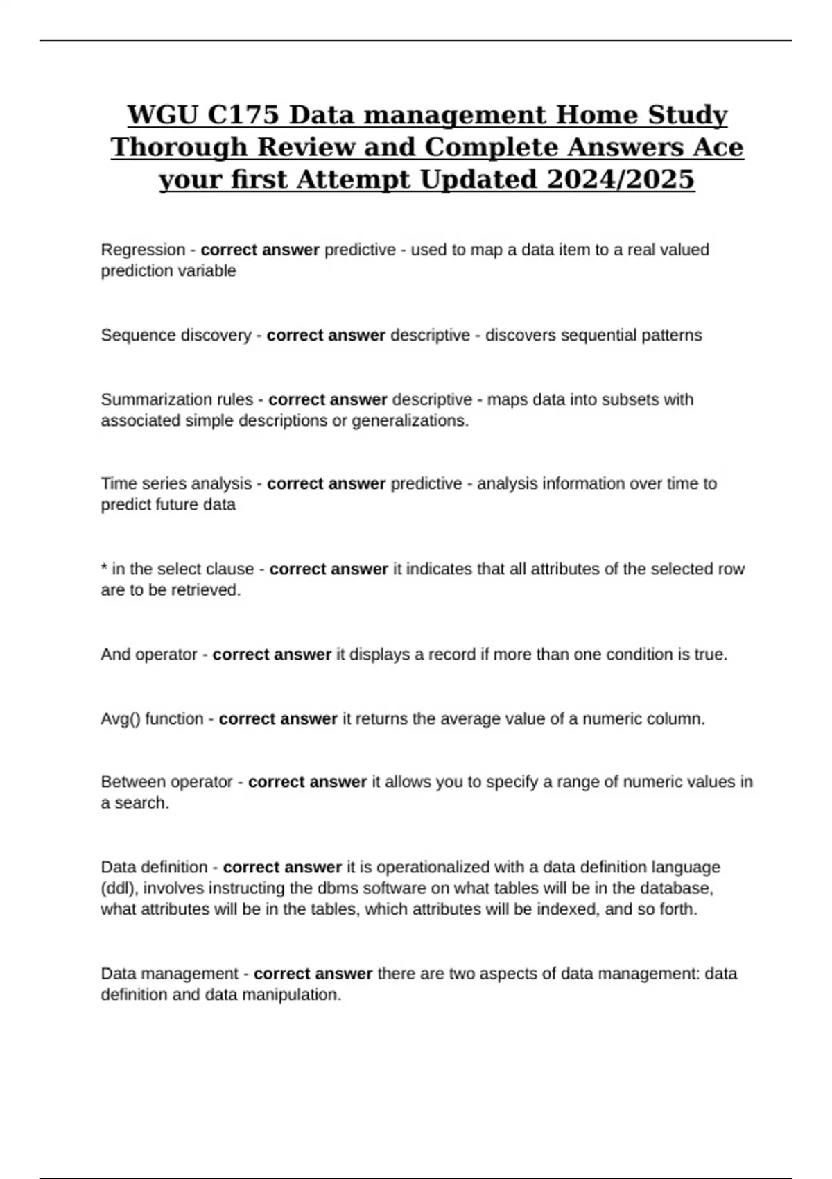 WGU C175 Data management Home Study Thorough Review and Complete Answers Ace your first Attempt Updated 2024/2025 Regression - correct answer predictive - used to map a data item to a real valued prediction variable Sequence discovery - correct answer descriptive - discovers sequential patterns Summarization rules - correct answer descriptive - maps data into subsets with associated simple descriptions or generalizations. Time series analysis - correct answer predictive - analysis information over time to predict future data * in the select clause - correct answer it indicates that all attributes of the selected row are to be retrieved. And operator - correct answer it displays a record if more than one condition is true. Avg() function - correct answer it returns the average value of a numeric column. Between operator - correct answer it allows you to specify a range of numeric values in a search. Data definition - correct answer it is operationalized with a data definition language (ddl), involves instructing the dbms software on what tables will be in the database, what attributes will be in the tables, which attributes will be indexed, and so forth. Data management - correct answer there are two aspects of data management: data definition and data manipulation. Distinct operator - correct answer it is used to eliminate duplicate rows in a query result. In operator - correct answer it allows you to specify a list of character strings to be included in a search. Join clause - correct answer it is used to combine rows from more than one table, based on a common field between them.