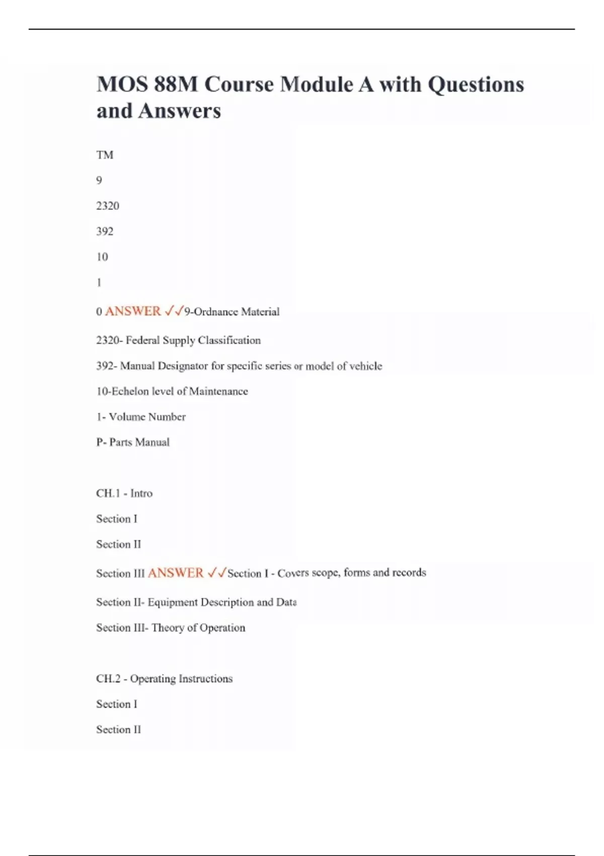 MOS 88M Course Module A with Questions and Answers TM 9 2320 392 10 1 0 ANSWER 9-Ordnance Material 2320- Federal Supply Classification 392- Manual Designator for specific series or model of vehicle 10-Echelon level of Maintenance 1- Volume Number P- Parts Manual CH.1 - Intro Section I Section II Section III ANSWER Section I - Covers scope, forms and records Section II- Equipment Description and Data Section III- Theory of Operation CH.2 - Operating Instructions Section I Section II