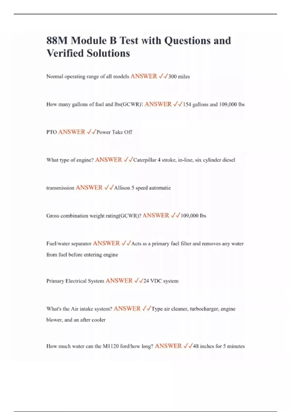 88M Module B Test with Questions and Verified Solutions Normal operating range of all models ANSWER 300 miles How many gallons of fuel and lbs(GCWR)? ANSWER 154 gallons and 109,000 lbs PTO ANSWER Power Take Off What type of engine? ANSWER Caterpillar 4 stroke, in-line, six cylinder diesel transmission ANSWER Allison 5 speed automatic Gross combination weight rating(GCWR)? ANSWER 109,000 lbs Fuel/water separator ANSWER Acts as a primary fuel filter and removes any water from fuel before entering engine Primary Electrical System ANSWER 24 VDC system What's the Air intake system? ANSWER Type air cleaner, turbocharger, engine