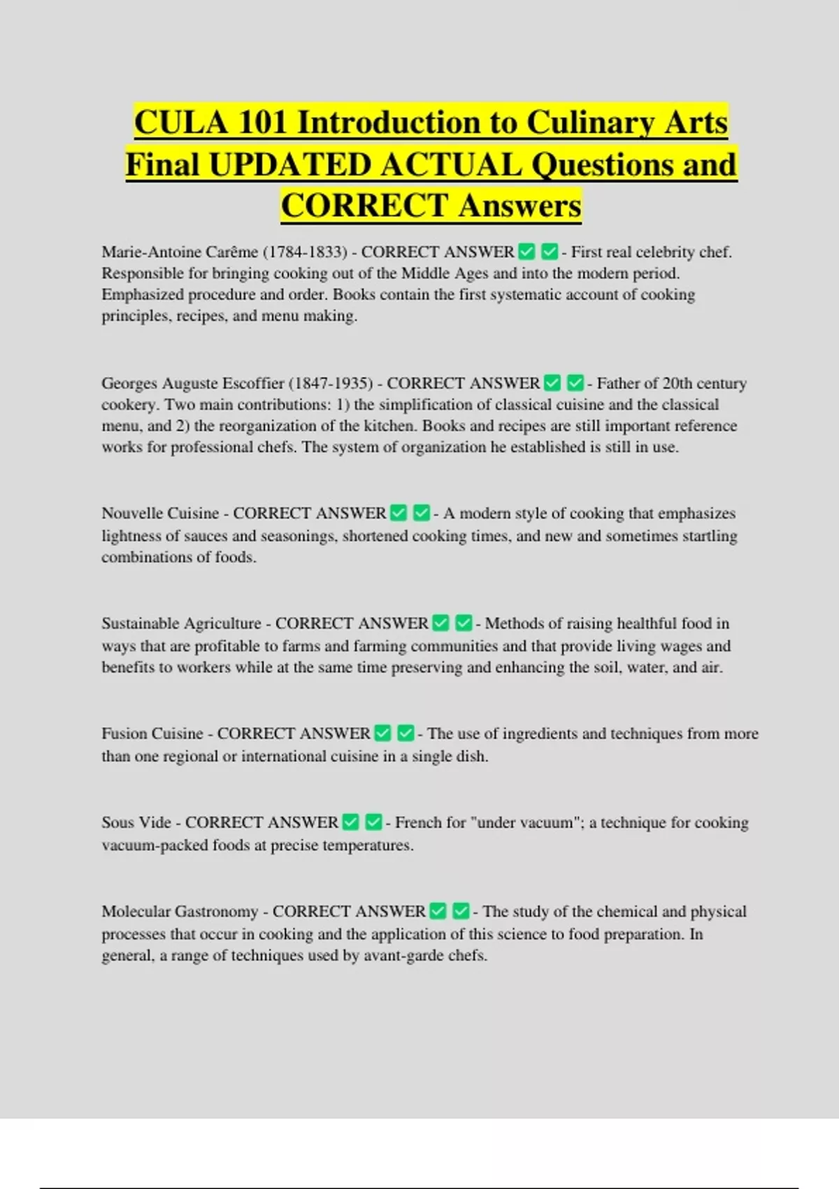 CULA 101 Introduction to Culinary Arts Final UPDATED ACTUAL Questions and CORRECT Answers Marie-Antoine Carême () - CORRECT ANSWER - First real celebrity chef. Responsible for bringing cooking out of the Middle Ages and into the modern period. Emphasized procedure and order. Books contain the first systematic account of cooking principles, recipes, and menu making.