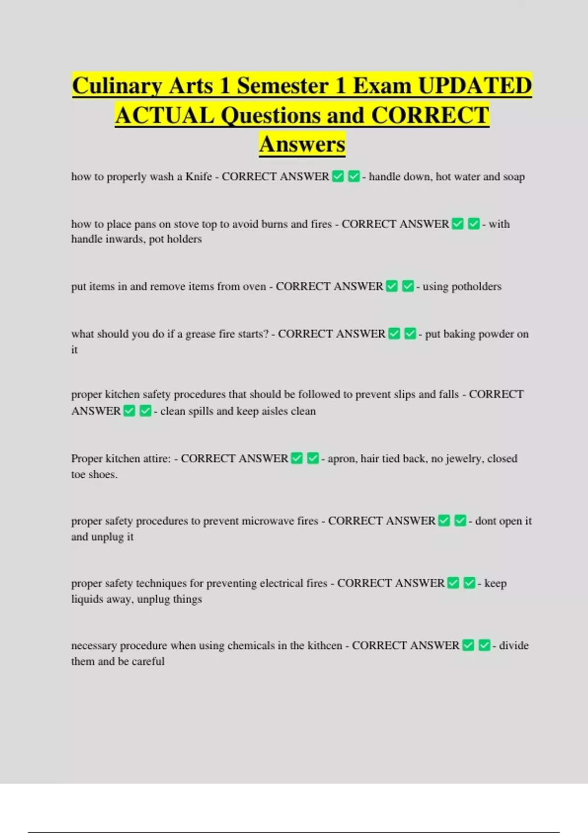 Culinary Arts 1 Semester 1 Exam UPDATED ACTUAL Questions and CORRECT Answers how to properly wash a Knife - CORRECT ANSWER - handle down, hot water and soap how to place pans on stove top to avoid burns and fires - CORRECT ANSWER - with handle inwards, pot holders