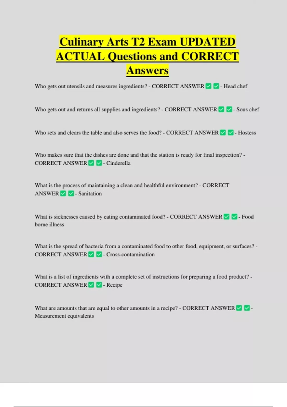 Culinary Arts T2 Exam UPDATED ACTUAL Questions and CORRECT Answers Who gets out utensils and measures ingredients? - CORRECT ANSWER - Head chef Who gets out and returns all supplies and ingredients? - CORRECT ANSWER - Sous chef Who sets and clears the table and also serves the food? - CORRECT ANSWER - Hostess