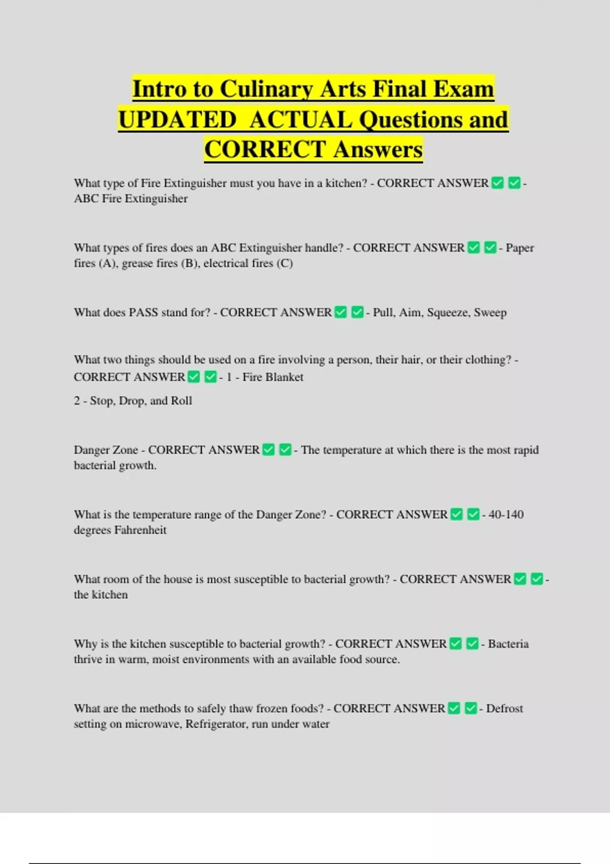 Intro to Culinary Arts Final Exam UPDATED ACTUAL Questions and CORRECT Answers What type of Fire Extinguisher must you have in a kitchen? - CORRECT ANSWER - ABC Fire Extinguisher What types of fires does an ABC Extinguisher handle? - CORRECT ANSWER - Paper fires (A), grease fires (B), electrical fires (C)