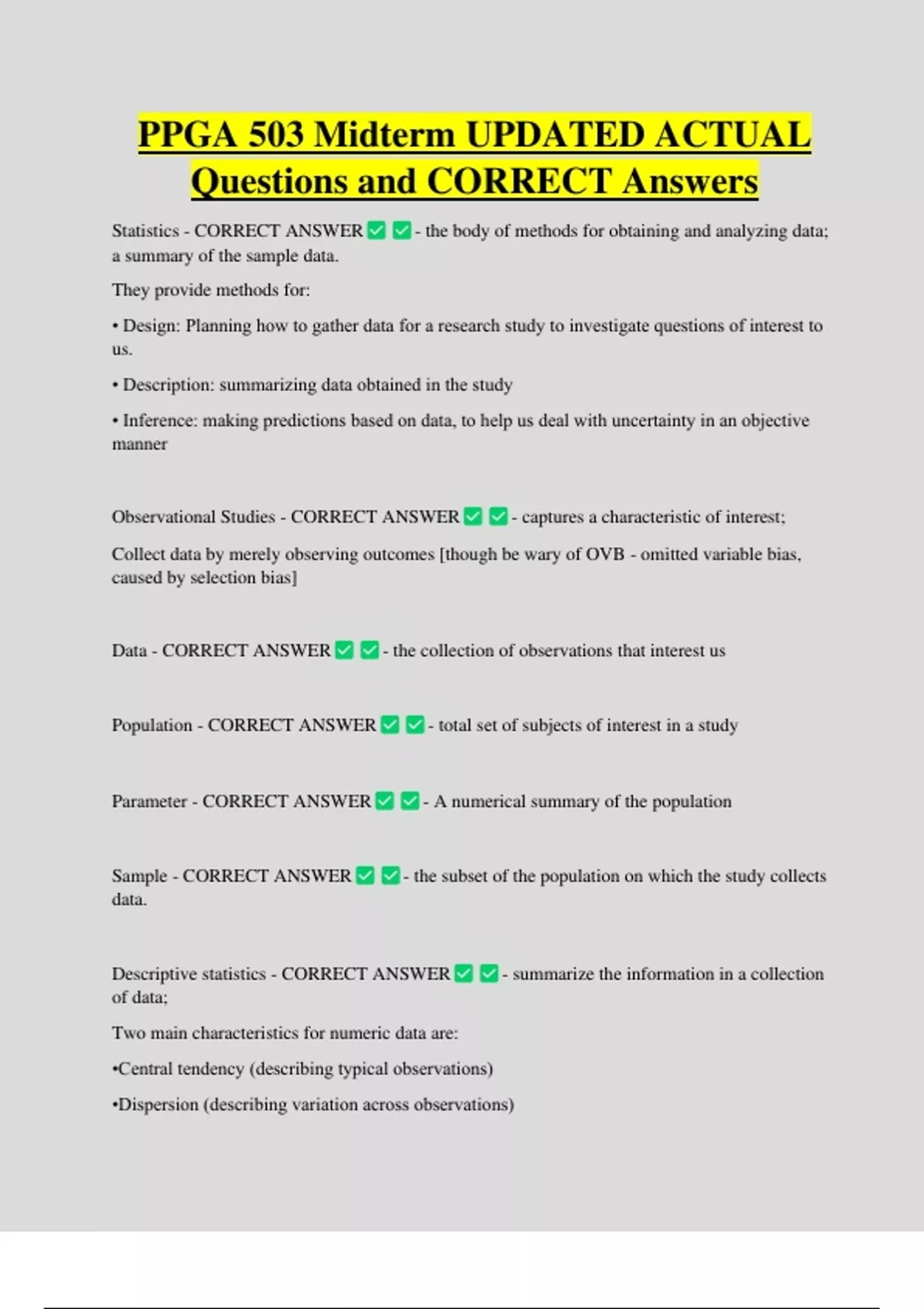 PPGA 503 Midterm UPDATED ACTUAL Questions and CORRECT Answers Statistics - CORRECT ANSWER - the body of methods for obtaining and analyzing data; a summary of the sample data. They provide methods for: • Design: Planning how to gather data for a research study to investigate questions of interest to us. • Description: summarizing data obtained in the study • Inference: making predictions based on data, to help us deal with uncertainty in an objective manne