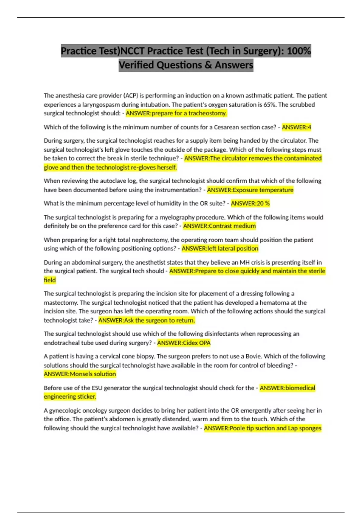 Practice Test)NCCT Practice Test (Tech in Surgery): 100% Verified Questions & Answers