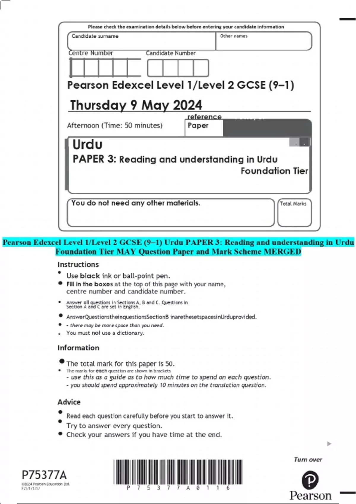 PACKAGE DEAL::::Pearson Edexcel Level 1/Level 2 GCSE (9–1) Urdu | Question Papers and Mark Scheme MERGED