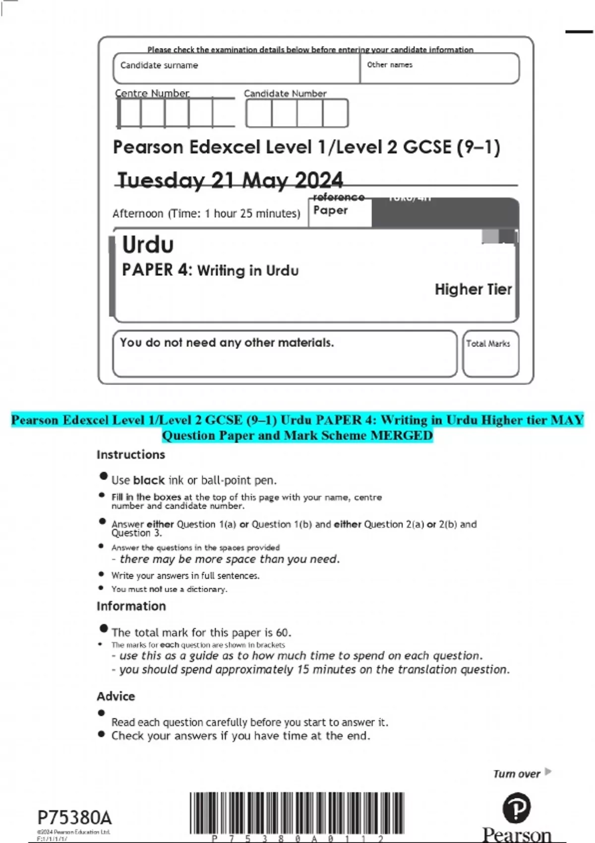 Pearson Edexcel Level 1/Level 2 GCSE (9–1) Urdu PAPER 4: Writing in Urdu Higher tier MAY Question Paper and Mark Scheme MERGED