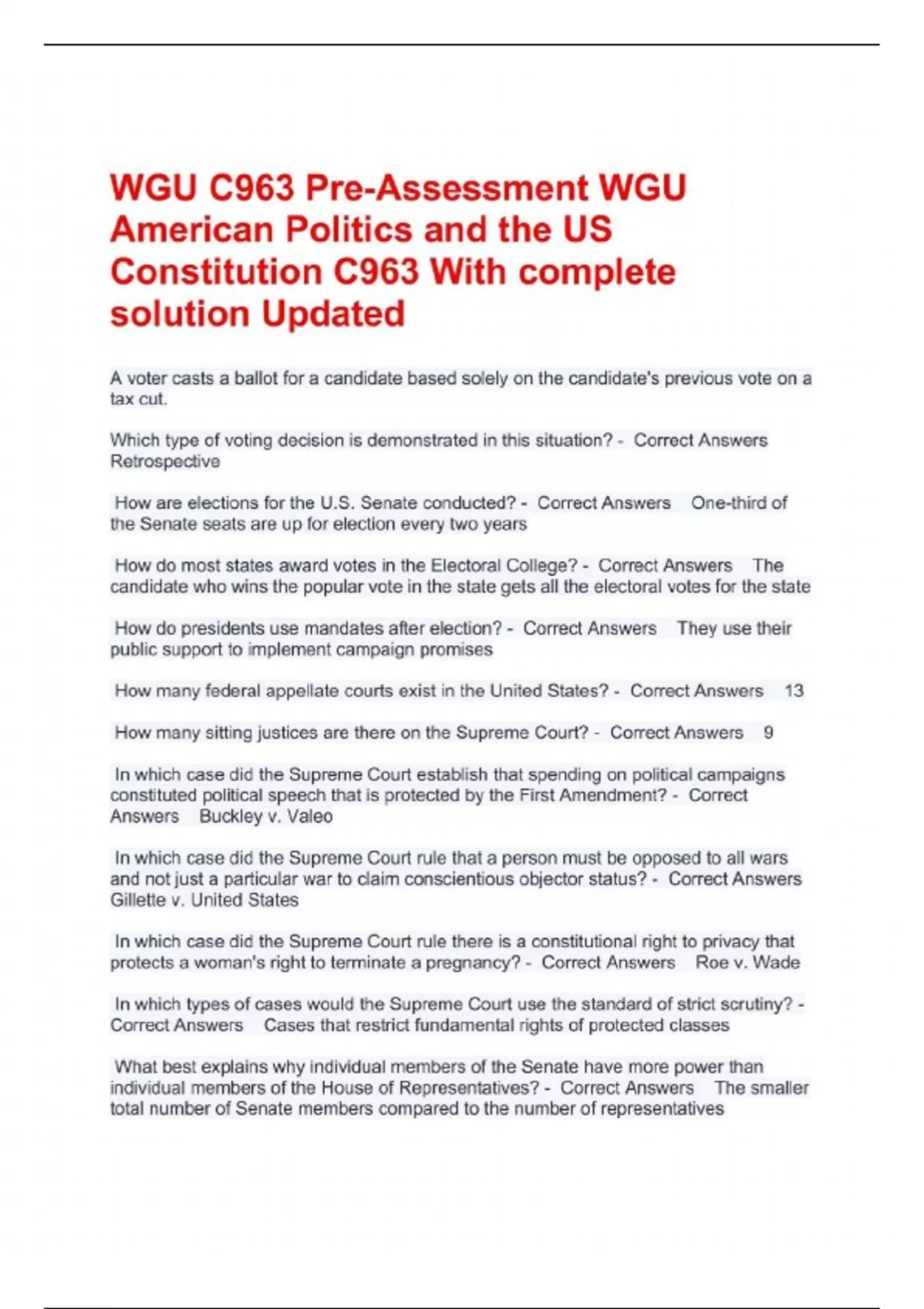 WGU C963 Pre-Assessment WGU American Politics and the US Constitution C963 With complete solution Updated