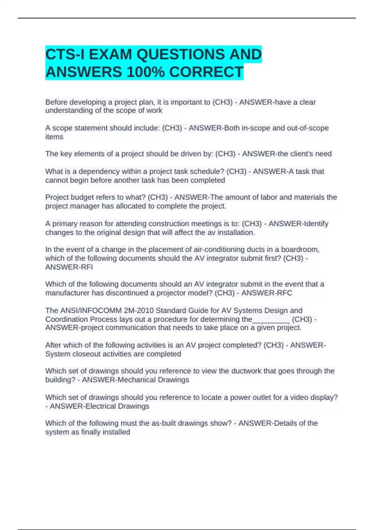 CTS-I EXAM QUESTIONS AND ANSWERS 100% CORRECTCTS-I EXAM QUESTIONS AND ANSWERS 100% CORRECTCTS-I EXAM QUESTIONS AND ANSWERS 100% CORRECTCTS-I EXAM QUESTIONS AND ANSWERS 100% CORRECT Before developing a project plan, it is important to (CH3) - ANSWER-have a clear understanding of the scope of work A scope statement should include: (CH3) - ANSWER-Both in-scope and out-of-scope items The key elements of a project should be driven by: (CH3) - ANSWER-the client's need What is a dependency within a project task schedule? (CH3) - ANSWER-A task that cannot begin before another task has been completed Project budget refers to what? (CH3) - ANSWER-The amount of labor and materials the project manager has allocated to complete the project.