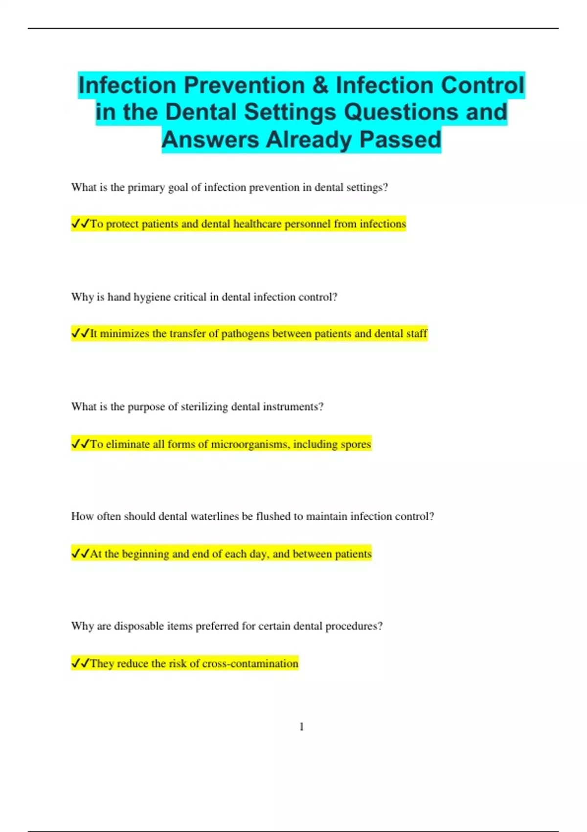 Infection Prevention & Infection Control in the Dental Settings Questions and Answers Already Passed What is the primary goal of infection prevention in dental settings? To protect patients and dental healthcare personnel from infections Why is hand hygiene critical in dental infection control? It minimizes the transfer of pathogens between patients and dental staff What is the purpose of sterilizing dental instruments? To eliminate all forms of microorganisms, including spores How often should dental waterlines be flushed to maintain infection control? At the beginning and end of each day, and between patients Why are disposable items preferred for certain dental procedures? They reduce the risk of cross-contamination 2 What is the role of personal protective equipment (PPE) in dental settings? To provide a barrier against exposure to infectious agents Why must high-speed handpieces be sterilized after every patient use? They come into direct contact with patient fluids and tissues How do pre-procedural mouth rinses help in infection prevention? They reduce the microbial load in the patient’s mouth What is the significance of wearing gloves during dental procedures? To protect hands from exposure to infectious materials Why should dental impressions and prosthetics be disinfected before being sent to the lab? To prevent transmission of pathogens to laboratory personnel What is the purpose of using barriers on dental equipment? To protect surfaces from contamination during procedures 3 Why is it essential to monitor autoclave performance regularly? To ensure effective sterilization of instruments How does proper disposal of sharps contribute to infection prevention? It prevents needle-stick injuries and exposure to bloodborne pathogens What is the significance of using single-use items for invasive procedures? They are sterile and reduce the risk of infection Why should dental staff be vaccinated against hepatitis B? To protect against potential exposure to the virus in clinical settings What is the importance of documenting sterilization cycles? To verify that instruments are consistently sterilized properly Why is respiratory hygiene important in dental clinics? It reduces the spread of airborne infections like influenza 4 What is the role of alcohol-based hand rubs in dental infection control? They provide a quick and effective method