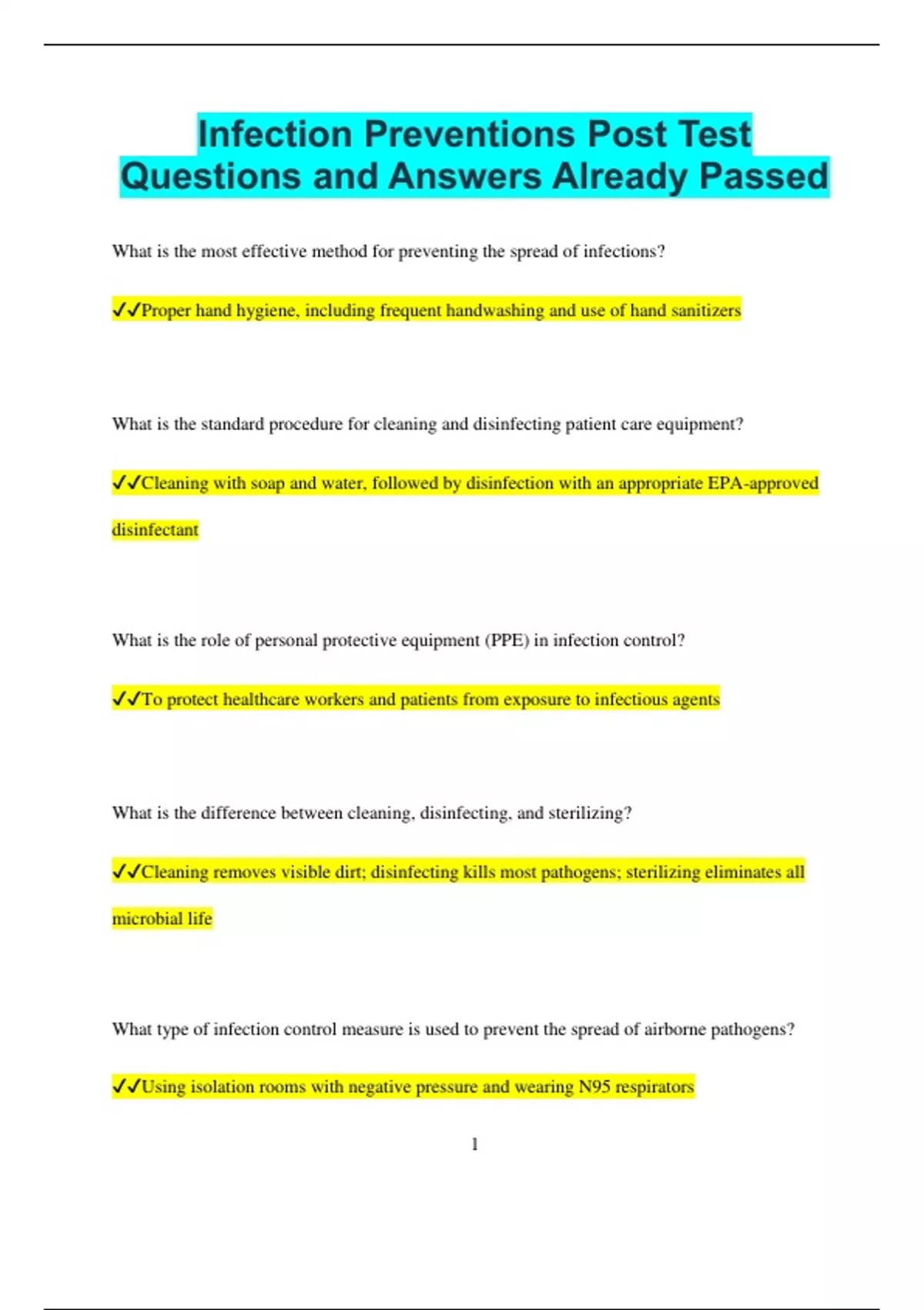 Infection Preventions Post Test Questions and Answers Already Passed What is the most effective method for preventing the spread of infections? Proper hand hygiene, including frequent handwashing and use of hand sanitizers What is the standard procedure for cleaning and disinfecting patient care equipment? Cleaning with soap and water, followed by disinfection with an appropriate EPA-approved disinfectant What is the role of personal protective equipment (PPE) in infection control? To protect healthcare workers and patients from exposure to infectious agents What is the difference between cleaning, disinfecting, and sterilizing? Cleaning removes visible dirt; disinfecting kills most pathogens; sterilizing eliminates all microbial life What type of infection control measure is used to prevent the spread of airborne pathogens? Using isolation rooms with negative pressure and wearing N95 respirators 2 Why is proper disposal of contaminated materials critical in infection prevention? It prevents the spread of pathogens and protects both healthcare workers and patients What is the purpose of the chain of infection model? To understand the process through which infections are transmitted and identify ways to break that chain What is the role of vaccination in infection prevention? Vaccination helps to protect individuals and communities from preventable infectious diseases What is a healthcare-associated infection (HAI)? An infection acquired by a patient during their stay in a healthcare facility What should be done when a healthcare worker has been exposed to a bloodborne pathogen? Report the incident immediately, seek medical evaluation, and follow post-exposure protocols 3 What is the correct procedure for handling contaminated linens in a healthcare facility? Place linens directly into a designated, color-coded laundry bag without shaking or contaminating the environment What is an example of an environmental control measure to prevent infection? Regular cleaning and disinfection of high-touch surfaces like doorknobs and light switches How often should healthcare workers receive training on infection prevention? At least annually or whenever new infection control protocols are introduced What is the purpose of antibiotic stewardship programs in infection prevention? To optimize antibiotic use, minimize resistance, and improve patient outcomes What is the role of surveillance in infection prevention? To monitor infection rates, identify outbreaks, and implement control measures What is the proper procedure for hand hygiene when caring for a patient? 4 Wash hands with soap and water or use hand sanitizer with at least 60% alcohol, especially after contact with body fluids or contaminated surfaces What is the most common mode of transmission for healthcare-associated infections? Contact transmission, either through direct patient