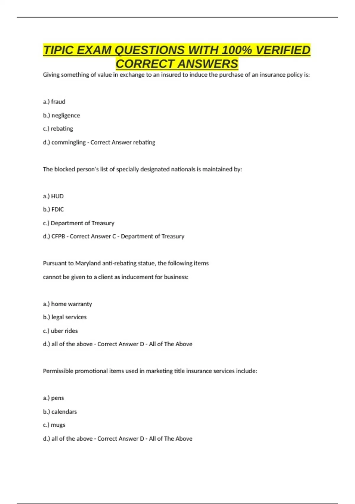 TIPIC EXAM QUESTIONS WITH 100% VERIFIED CORRECT ANSWERS Giving something of value in exchange to an insured to induce the purchase of an insurance policy is: a.) fraud b.) negligence c.) rebating d.) commingling - Correct Answer rebating The blocked person's list of specially designated nationals is maintained by: a.) HUD b.) FDIC c.) Department of Treasury d.) CFPB - Correct Answer C - Department of Treasury Pursuant to Maryland anti-rebating statue, the following items cannot be given to a client as inducement for business: a.) home warranty b.) legal services c.) uber rides d.) all of the above - Correct Answer D - All of The Above Permissible promotional items used in marketing title insurance services include: a.) pens b.) calendars c.) mugs d.) all of the above - Correct Answer D - All of The Above