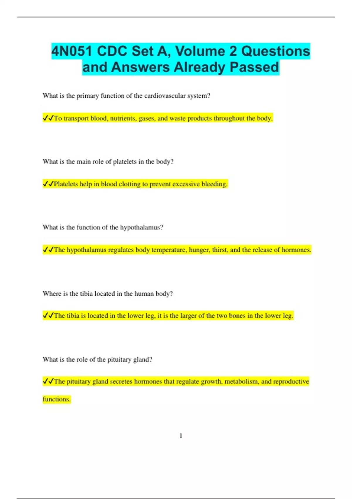 4N051 CDC Set A, Volume 2 Questions and Answers Already Passed What is the primary function of the cardiovascular system? To transport blood, nutrients, gases, and waste products throughout the body. What is the main role of platelets in the body? Platelets help in blood clotting to prevent excessive bleeding. What is the function of the hypothalamus? The hypothalamus regulates body temperature, hunger, thirst, and the release of hormones. Where is the tibia located in the human body? The tibia is located in the lower leg, it is the larger of the two bones in the lower leg. What is the role of the pituitary gland? The pituitary gland secretes hormones that regulate growth, metabolism, and reproductive functions. 2 What part of the brain controls balance and coordination? The cerebellum controls balance, posture, and coordination of voluntary movements. What is the function of the adrenal glands? The adrenal glands produce hormones such as adrenaline and cortisol, which help the body respond to stress. What does the skeletal system do for the body? The skeletal system provides structure, protects organs, and facilitates movement. Where is the liver located, and what is its primary function? The liver is located in the upper right side of the abdomen, and it detoxifies chemicals, produces bile, and stores glycogen. What is the function of the small intestine? The small intestine absorbs nutrients from digested food into the bloodstream. What is the role of the pancreas in digestion? 3 The pancreas produces digestive enzymes and insulin to help regulate blood sugar. Where is the spinal cord located in the body? The spinal cord runs from the base of the brain down through the vertebral column. What does the lymphatic system do? The lymphatic system helps in immune function and fluid balance by draining excess fluid from tissues. What is the primary role of the large intestine? The large intestine absorbs water and salts from undigested food and forms solid waste. What is the function of the immune system? The immune system protects the body from harmful pathogens and diseases. What is the role of the kidneys in the body? The kidneys filter waste from the blood, regulate fluid balance, and produce urine. 4 What is the purpose of the endocrine system? The endocrine system produces hormones that regulate