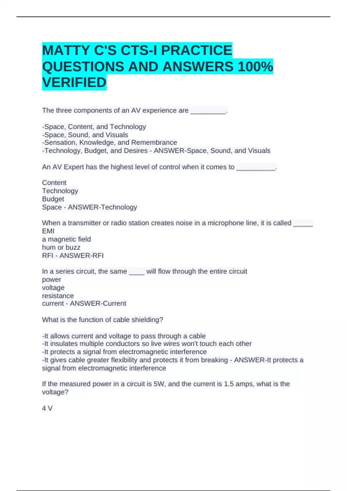MATTY C'S CTS-I PRACTICE QUESTIONS AND ANSWERS 100% VERIFIEDMATTY C'S CTS-I PRACTICE QUESTIONS AND ANSWERS 100% VERIFIEDMATTY C'S CTS-I PRACTICE QUESTIONS AND ANSWERS 100% VERIFIEDMATTY C'S CTS-I PRACTICE QUESTIONS AND ANSWERS 100% VERIFIED The three components of an AV experience are _________. -Space, Content, and Technology -Space, Sound, and Visuals -Sensation, Knowledge, and Remembrance -Technology, Budget, and Desires - ANSWER-Space, Sound, and Visuals An AV Expert has the highest level of control when it comes to __________. Content Technology Budget Space - ANSWER-Technology When a transmitter or radio station creates noise in a microphone line, it is called _____ EMI a magnetic field hum or buzz RFI - ANSWER-RFI In a series circuit, the same ____ will flow through the entire circuit power voltage resistance current - ANSWER-Current