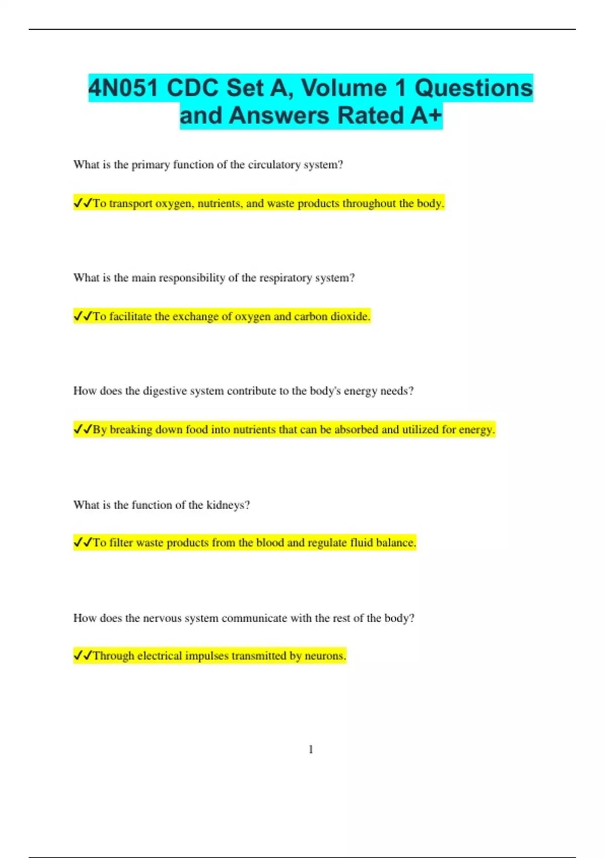 4N051 CDC Set A, Volume 1 Questions and Answers Rated A+ What is the primary function of the circulatory system? To transport oxygen, nutrients, and waste products throughout the body. What is the main responsibility of the respiratory system? To facilitate the exchange of oxygen and carbon dioxide. How does the digestive system contribute to the body's energy needs? By breaking down food into nutrients that can be absorbed and utilized for energy. What is the function of the kidneys? To filter waste products from the blood and regulate fluid balance. How does the nervous system communicate with the rest of the body? Through electrical impulses transmitted by neurons. 2 What is the role of red blood cells? To carry oxygen from the lungs to the tissues and return carbon dioxide to the lungs. What is the function of platelets in blood? To help with blood clotting and prevent excessive bleeding. What is the role of the immune system? To protect the body from infections and foreign invaders. What part of the brain controls voluntary muscle movements? The motor cortex. How do white blood cells protect the body? By attacking and destroying pathogens like bacteria and viruses. What is the primary function of the skeletal system? To provide support, protect vital organs, and enable movement. 3 How does the lymphatic system support the immune system? By transporting lymph, which contains immune cells that help fight infection. What is the function of the endocrine system? To regulate body functions through the release of hormones. How does the body regulate body temperature? Through processes like sweating, shivering, and blood vessel constriction or dilation. What is the role of the pancreas in digestion? To produce enzymes that aid in the digestion of food and insulin for blood sugar regulation. How does the body maintain fluid balance? Through the kidneys, which regulate water and electrolyte levels. What is the purpose of the integumentary system? To protect the body from external damage, regulate temperature, and prevent dehydration. 4 What are the primary functions of the digestive enzymes? To break down food into smaller molecules that the body can absorb. What is the function of the heart in the circulatory system? To pump blood throughout the body, delivering oxygen and nutrients. How does the body respond to stress? By activating the sympathetic nervous