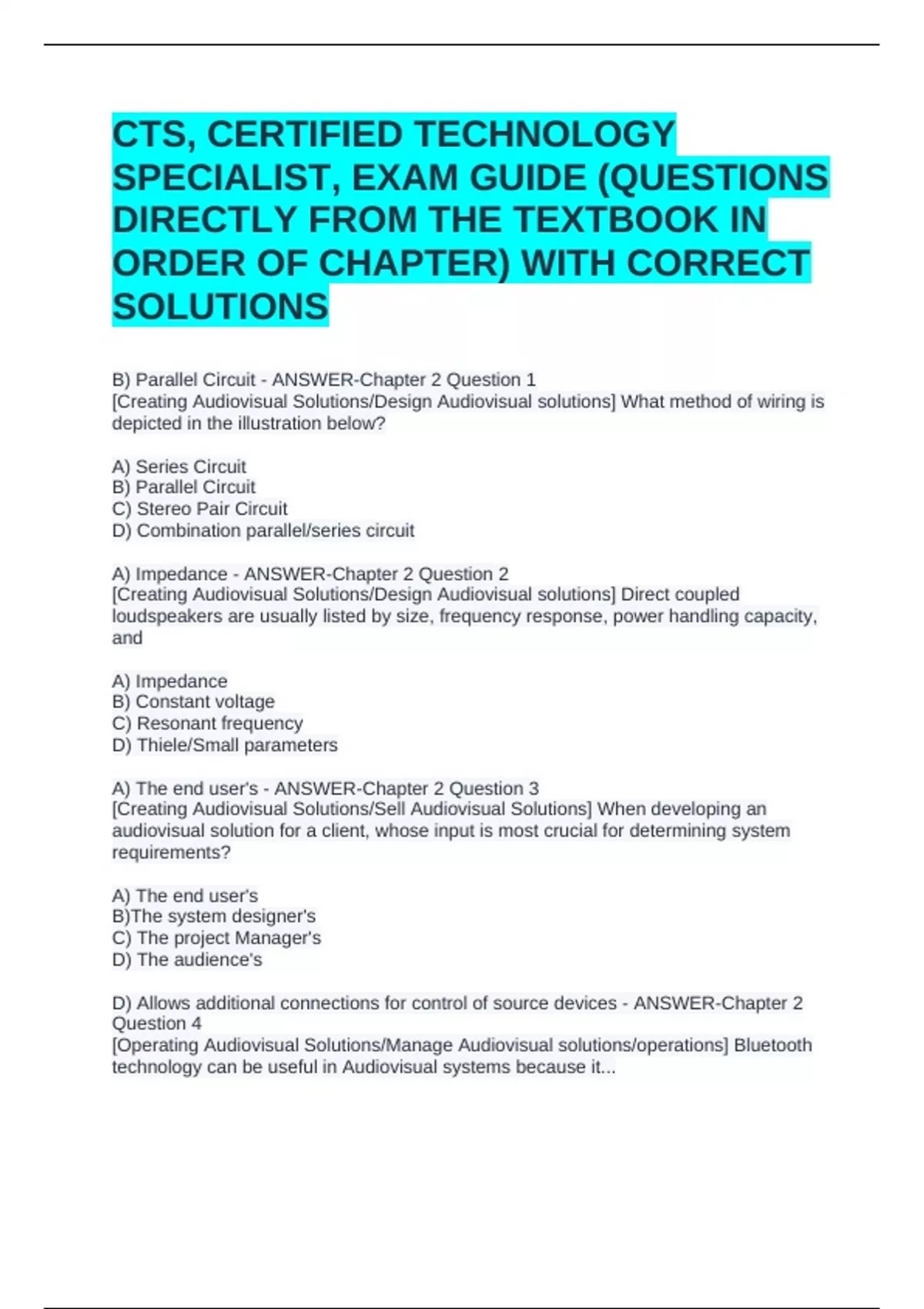 CTS, CERTIFIED TECHNOLOGY SPECIALIST, EXAM GUIDE (QUESTIONS DIRECTLY FROM THE TEXTBOOK IN ORDER OF CHAPTER) WITH CORRECT SOLUTIONSCTS, CERTIFIED TECHNOLOGY SPECIALIST, EXAM GUIDE (QUESTIONS DIRECTLY FROM THE TEXTBOOK IN ORDER OF CHAPTER) WITH CORRECT SOLUTIONSCTS, CERTIFIED TECHNOLOGY SPECIALIST, EXAM GUIDE (QUESTIONS DIRECTLY FROM THE TEXTBOOK IN ORDER OF CHAPTER) WITH CORRECT SOLUTIONS B) Parallel Circuit - ANSWER-Chapter 2 Question 1 [Creating Audiovisual Solutions/Design Audiovisual solutions] What method of wiring is depicted in the illustration below? A) Series Circuit B) Parallel Circuit C) Stereo Pair Circuit D) Combination parallel/series circuit A) Impedance - ANSWER-Chapter 2 Question 2 [Creating Audiovisual Solutions/Design Audiovisual solutions] Direct coupled loudspeakers are usually listed by size, frequency response, power handling capacity, and A) Impedance B) Constant voltage