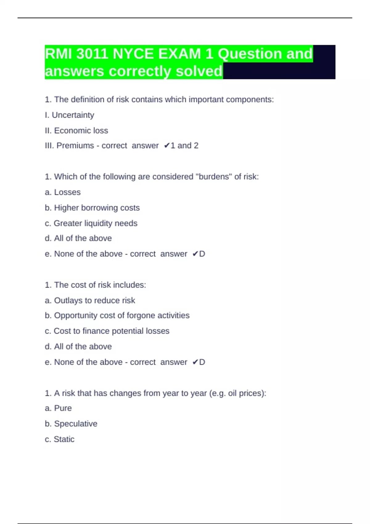 RMI 3011 NYCE EXAM 1 RMI 3011 Florida State University -Question and answers correctly solved 1. The definition of risk contains which important components: I. Uncertainty II. Economic loss III. Premiums - correct answer 1 and 2 1. Which of the following are considered "burdens" of risk: a. Losses b. Higher borrowing costs c. Greater liquidity needs d. All of the above e. None of the above - correct answer D 1. The cost of risk includes: a. Outlays to reduce risk b. Opportunity cost of forgone activities c. Cost to finance potential losses d. All of the above e. None of the above - correct answer D 1. A risk that has changes from year to year (e.g. oil prices): a. Pure b. Speculative c. Static d. Dynamic e. Subjective - correct answer D 1. A risk that has only two outcomes (e.g. auto theft) loss or no loss is considered: a. Pure b. Speculative c. Static d. Dynamic e. Subjective - correct answer A