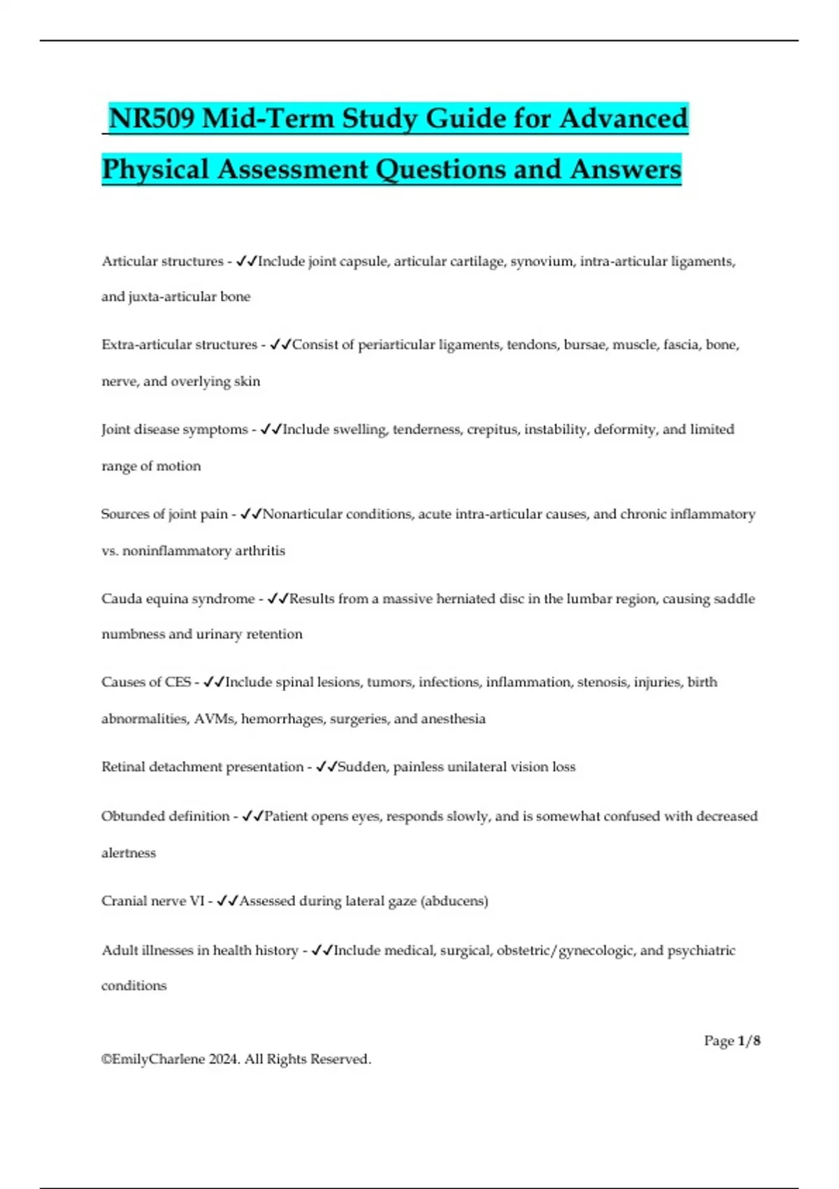 NR509 Mid-Term Study Guide for Advanced Physical Assessment Questions and Answers