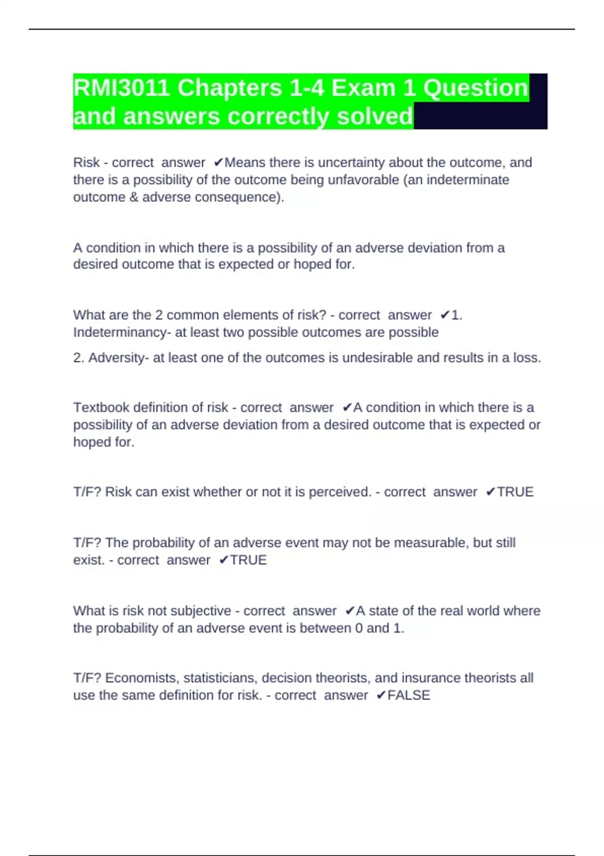 RMI3011 Chapters 1-4 Exam 1 RMI 3011 Florida State University -Question and answers correctly solved Risk - correct answer Means there is uncertainty about the outcome, and there is a possibility of the outcome being unfavorable (an indeterminate outcome & adverse consequence). A condition in which there is a possibility of an adverse deviation from a desired outcome that is expected or hoped for. What are the 2 common elements of risk? - correct answer 1. Indeterminancy- at least two possible outcomes are possible 2. Adversity- at least one of the outcomes is undesirable and results in a loss. Textbook definition of risk - correct answer A condition in which there is a possibility of an adverse deviation from a desired outcome that is expected or hoped for. T/F? Risk can exist whether or not it is perceived. - correct answer TRUE T/F? The probability of an adverse event may not be measurable, but still exist. - correct answer TRUE What is risk not subjective - correct answer A state of the real world where the probability of an adverse event is between 0 and 1. T/F? Economists, statisticians, decision theorists, and insurance theorists all use the same definition for