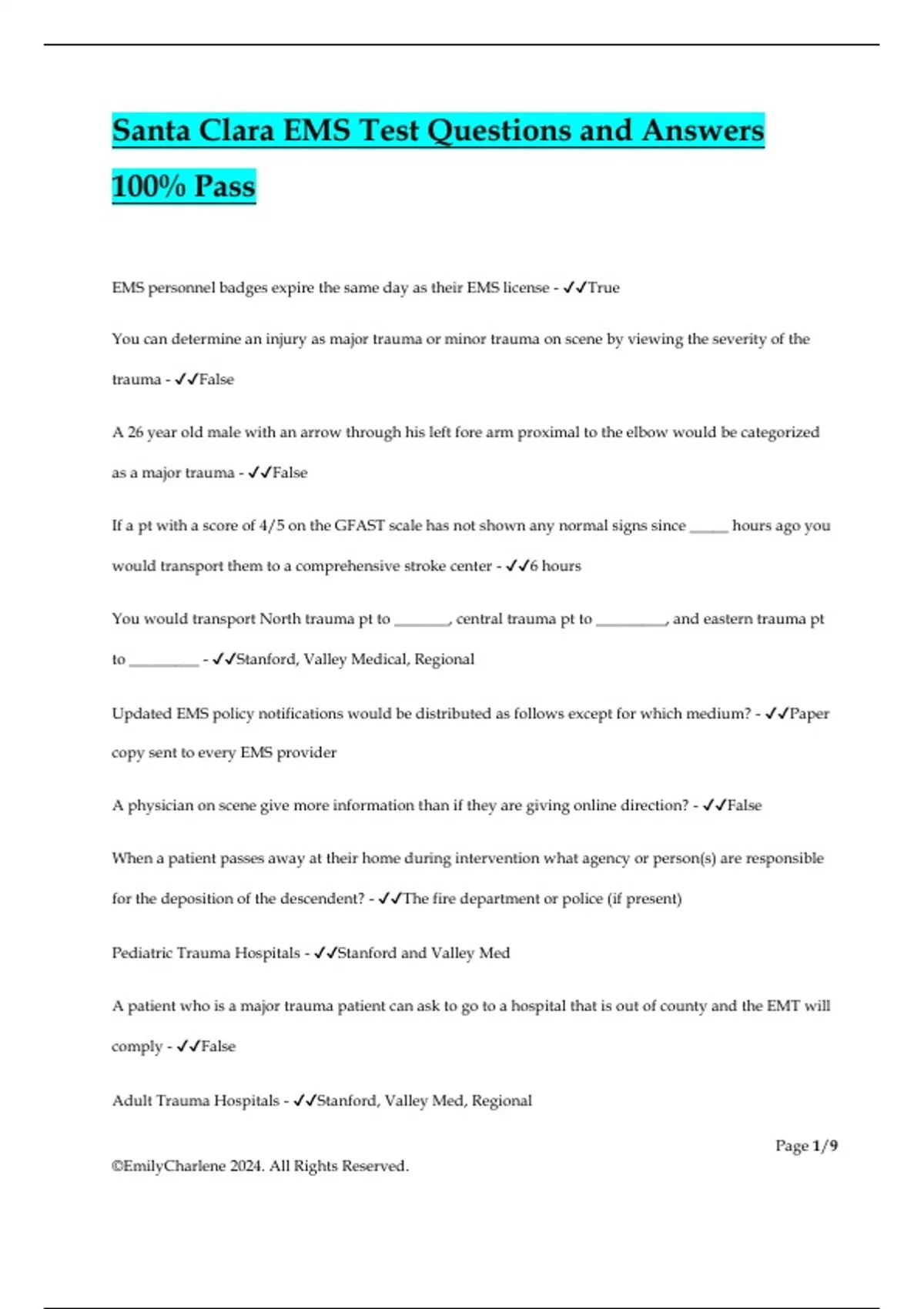 Santa Clara EMS Test Questions and Answers 100% Pass EMS personnel badges expire the same day as their EMS license - True You can determine an injury as major trauma or minor trauma on scene by viewing the severity of the trauma - False A 26 year old male with an arrow through his left fore arm proximal to the elbow would be categorized as a major trauma - False If a pt with a score of 4/5 on the GFAST scale has not shown any normal signs since _____ hours ago you would transport them to a comprehensive stroke center - 6 hours You would transport North trauma pt to _______, central trauma pt to _________, and eastern trauma pt to _________ - Stanford, Valley Medical, Regional Updated EMS policy notifications would be distributed as follows except for which medium? - Paper copy sent to every EMS provider A physician on scene give more information than if they are giving online direction? - False When a patient passes away at their home during intervention what agency or person(s) are responsible for the deposition of the descendent? - The fire department or police (if present) Pediatric Trauma Hospitals - Stanford and Valley Med A patient who is a major trauma patient can ask to go to a hospital that is out of county and the EMT will comply - False Adult Trauma Hospitals - Stanford, Valley Med, Regional Page 2/9 ©EmilyCharlene 2024. All Rights Reserved. Fire can transport when - -pt needs RLS transport and county EMS is not on scene for at least 18 minutes -pt is in cardiac/respiratory arrest -STEMI/Stroke alert -Major Trauma Criteria -Needs rapid transport -uncontrollable airway EMS directors in an MCI can do all of the following except - Take jurisdiction of the local law enforcement In extremis means - -protruding limb -uncontrollable airway -unable to stop bleeding after use of tourniquet Medical Health Operational Area Coordinator - The Medical Health Operational Are