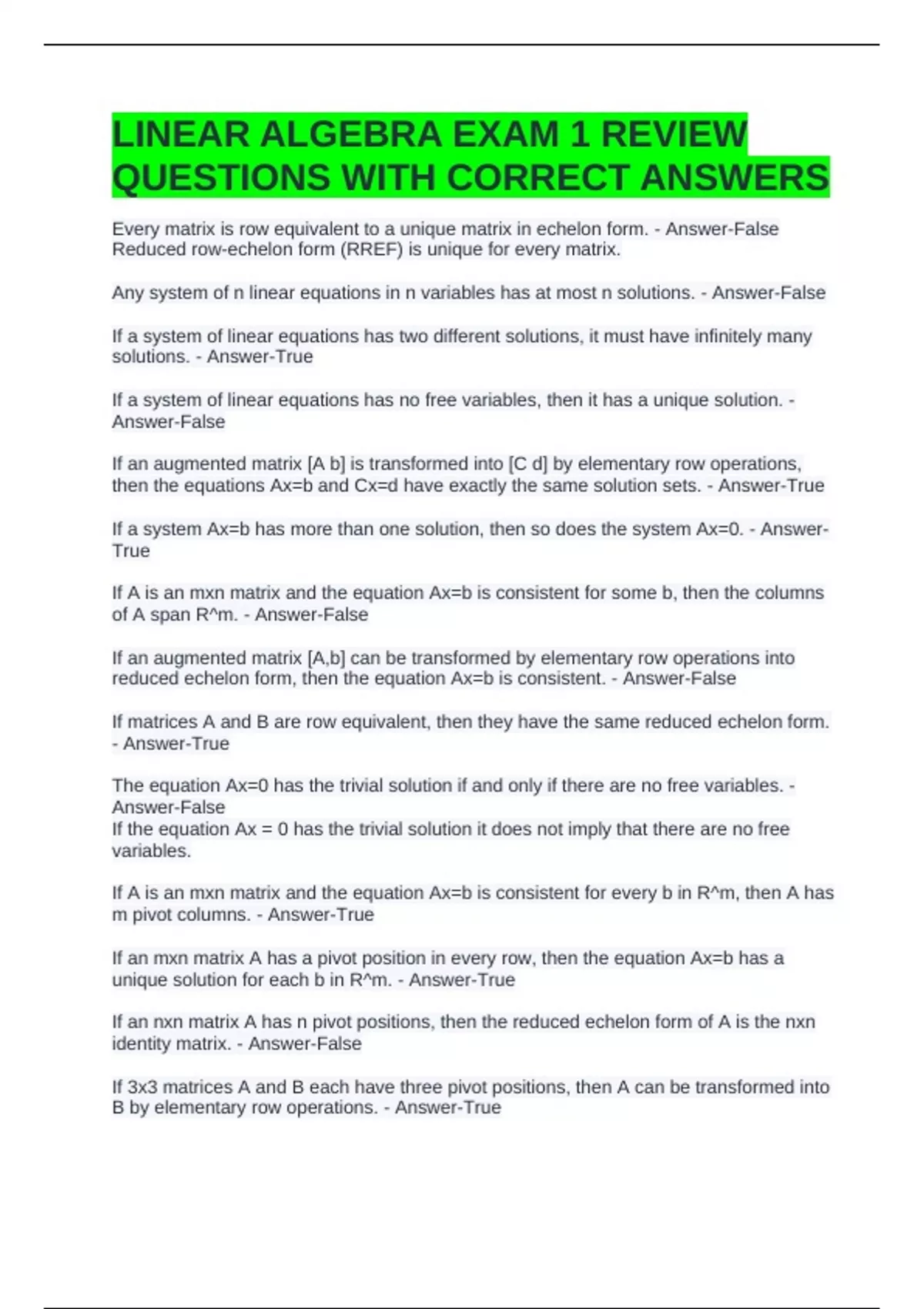 Every matrix is row equivalent to a unique matrix in echelon form. - Answer-False