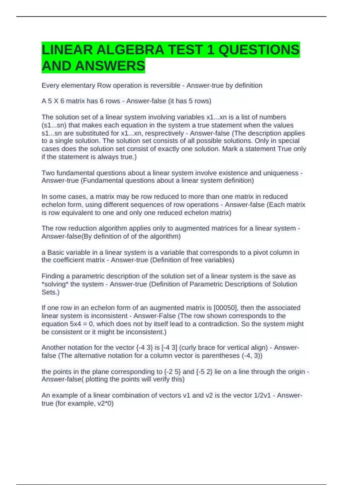 A 5 X 6 matrix has 6 rows - Answer-false (it has 5 rows)