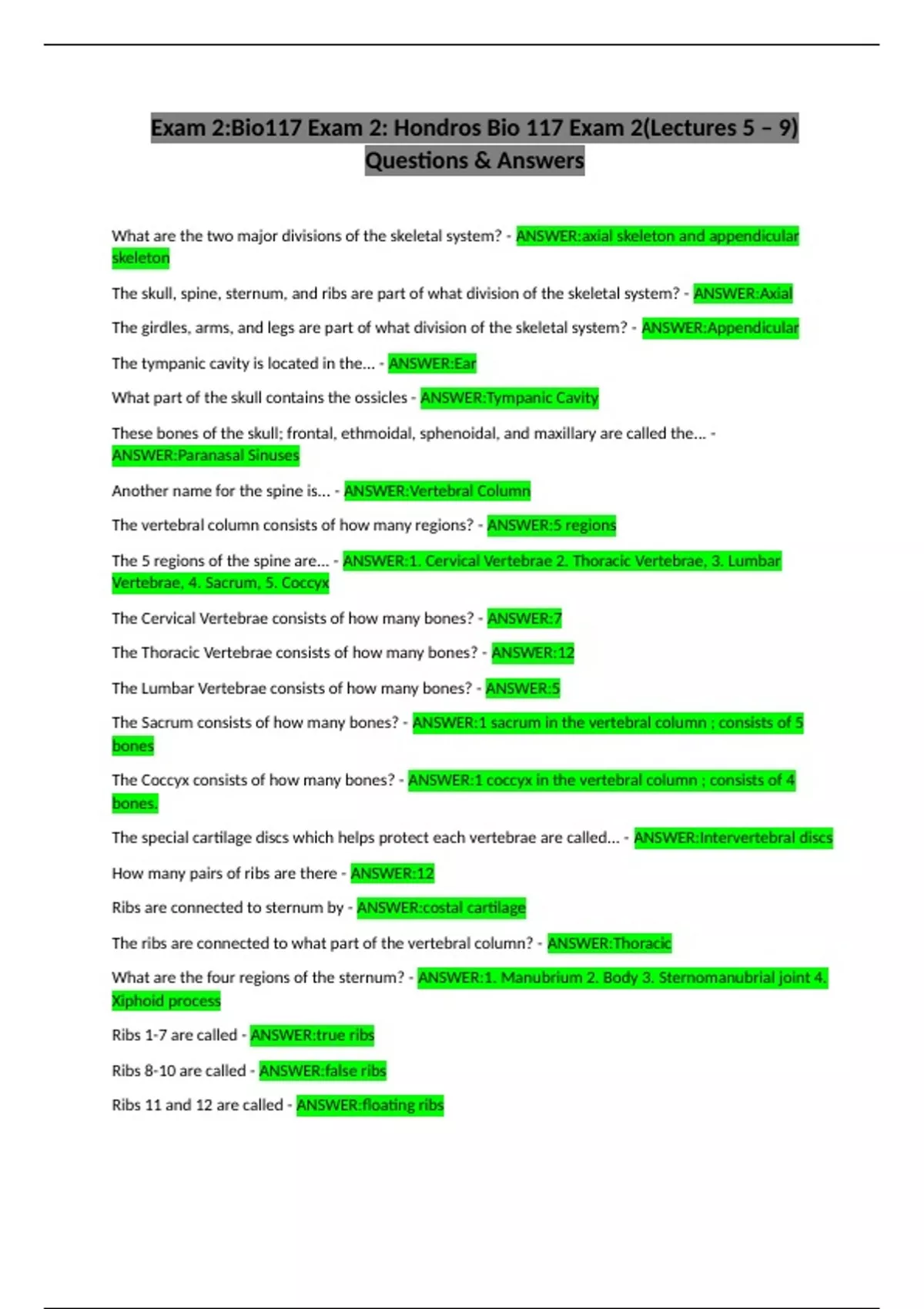 The skull, spine, sternum, and ribs are part of what division of the skeletal system? - ANSWER:Axial