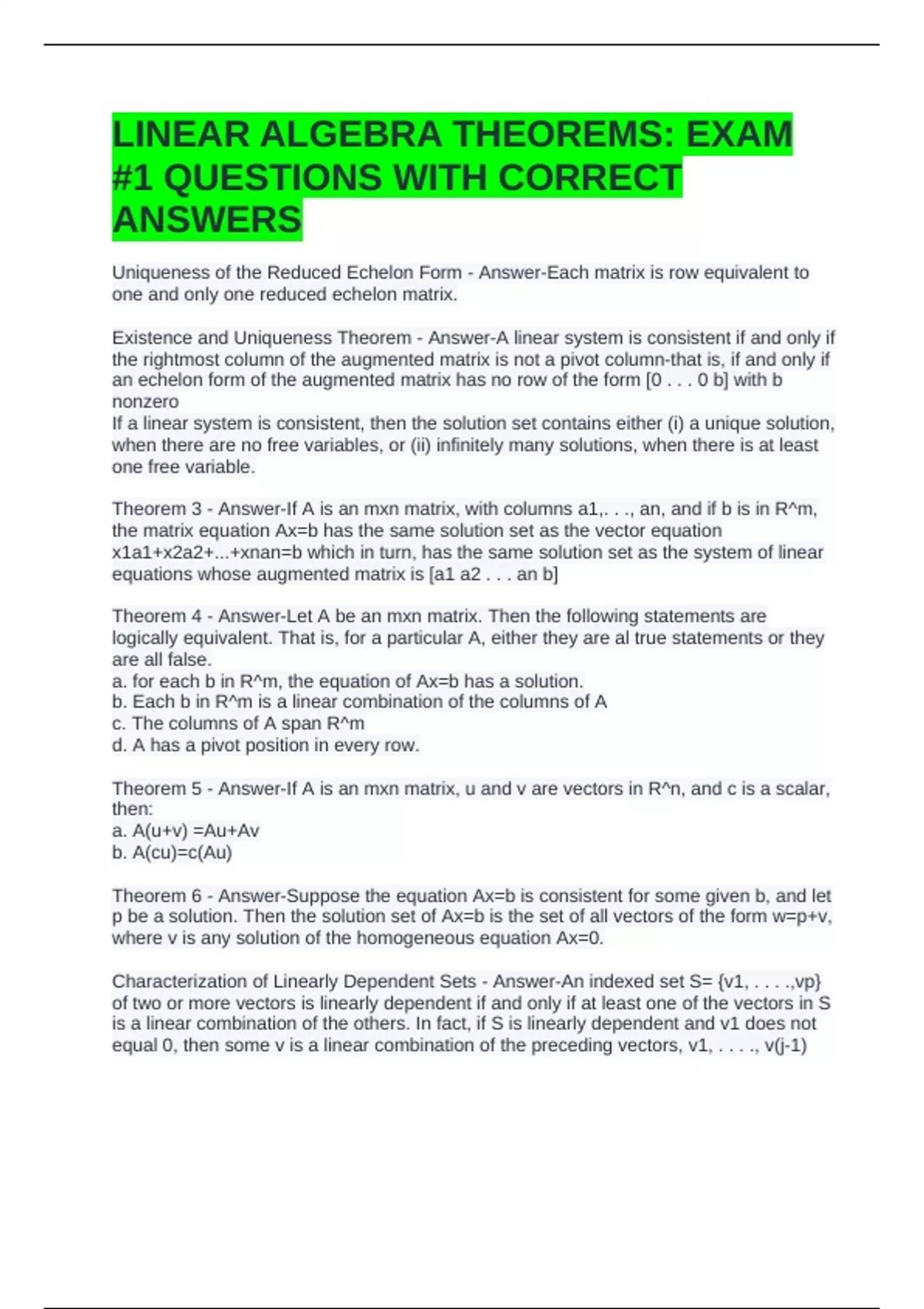 LINEAR ALGEBRA THEOREMS: EXAM #1 QUESTIONS WITH CORRECT ANSWERS
