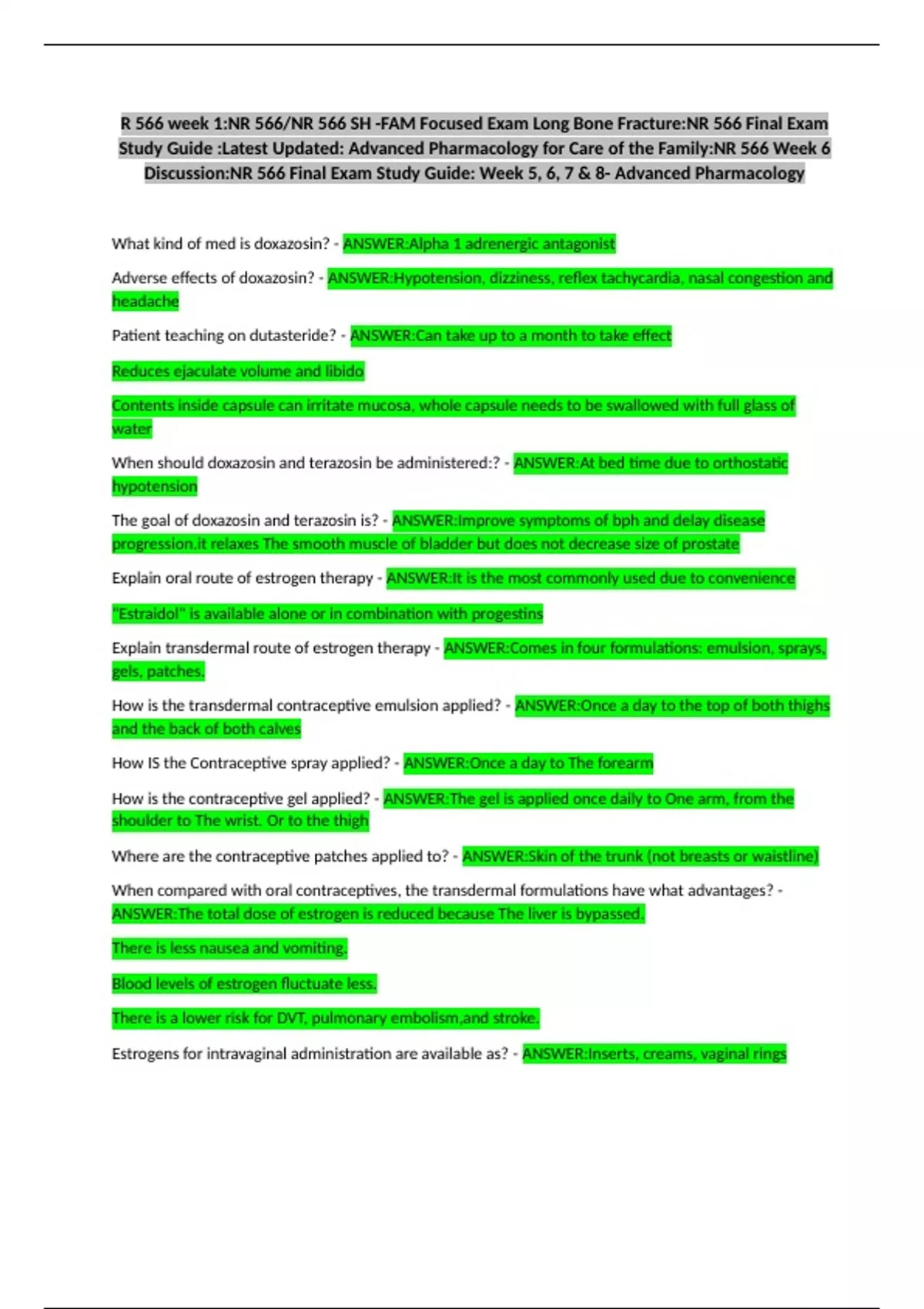 Discussion:NR 566 Final Exam Study Guide: Week 5, 6, 7 & 8- Advanced Pharmacology