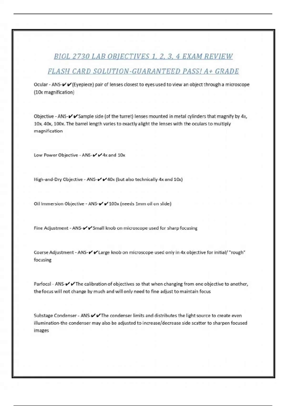 BIOL 2730 LAB OBJECTIVES 1, 2, 3, 4 EXAM REVIEW FLASH CARD SOLUTION-GUARANTEED PASS! A+ GRADE Ocular - ANS-(Eyepiece) pair of lenses closest to eyes used to view an object through a microscope (10x magnification) Objective - ANS-Sample side (of the turret) lenses mounted in metal cylinders that magnify by 4x, 10x, 40x, 100x. The barrel length varies to exactly alight the lenses with the oculars to multiply magnification Low Power Objective - ANS-4x and 10x High-and-Dry Objective - ANS-40x (but also technically 4x and 10x) Oil Immersion Objective - ANS-100x (needs 1mm oil on slide) Fine Adjustment - ANS-Small knob on microscope used for sharp focusing Coarse Adjustment - ANS-Large knob on microscope used only in 4x objective for initial/ "rough" focusing Parfocal - ANS-The calibration of objectives so that when changing from one objective to another, the focus will not change by much and will only need to fine adjust to maintain focus Substage Condenser - ANS-The condenser limits and distributes the light source to create even illumination-the condenser may also be adjusted to increase/decrease side scatter to sharpen focused images Iris Diaphragm - ANS-A camera like diaphragm mounted with the condenser that can be used to adjust the amount of light that illuminates a sample Mechanical Stage - ANS-Holds samples steady and flat and allows for fine movement of the slides in a 2 dimensions utilizing dials mounted on the side Resolution - ANS-(Resolving power) the smallest distance 2 points can be brought together and still appear as separate points Wavelength - ANS