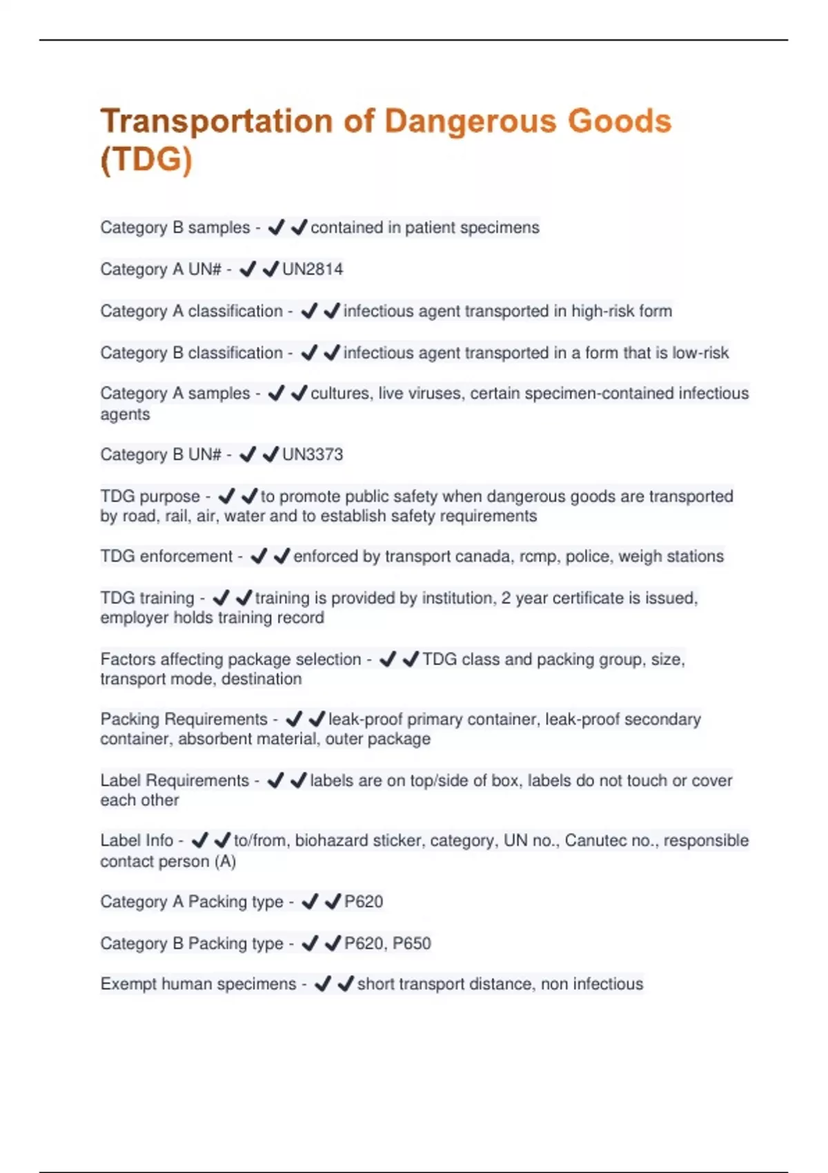 Category B samples - ️️contained in patient specimens Category A UN# - ️️UN2814 Category A classification - ️️infectious agent transported in high-risk form Category B classification - ️️infectious agent transported in a form that is low-risk Category A samples - ️️cultures, live viruses, certain specimen-contained infectious agents Category B UN# - ️️UN3373 TDG purpose - ️️to promote public safety when dangerous goods are transported by road, rail, air, water and to establish safety requirements TDG enforcement - ️️enforced by transport canada, rcmp, police, weigh stations TDG training - ️️training is provided by institution, 2 year certificate is issued, employer holds training record Factors affecting package selection - ️️TDG class and packing group, size, transport mode, destination Packing Requirements - ️️leak-proof primary container, leak-proof secondary container, absorbent material, outer package