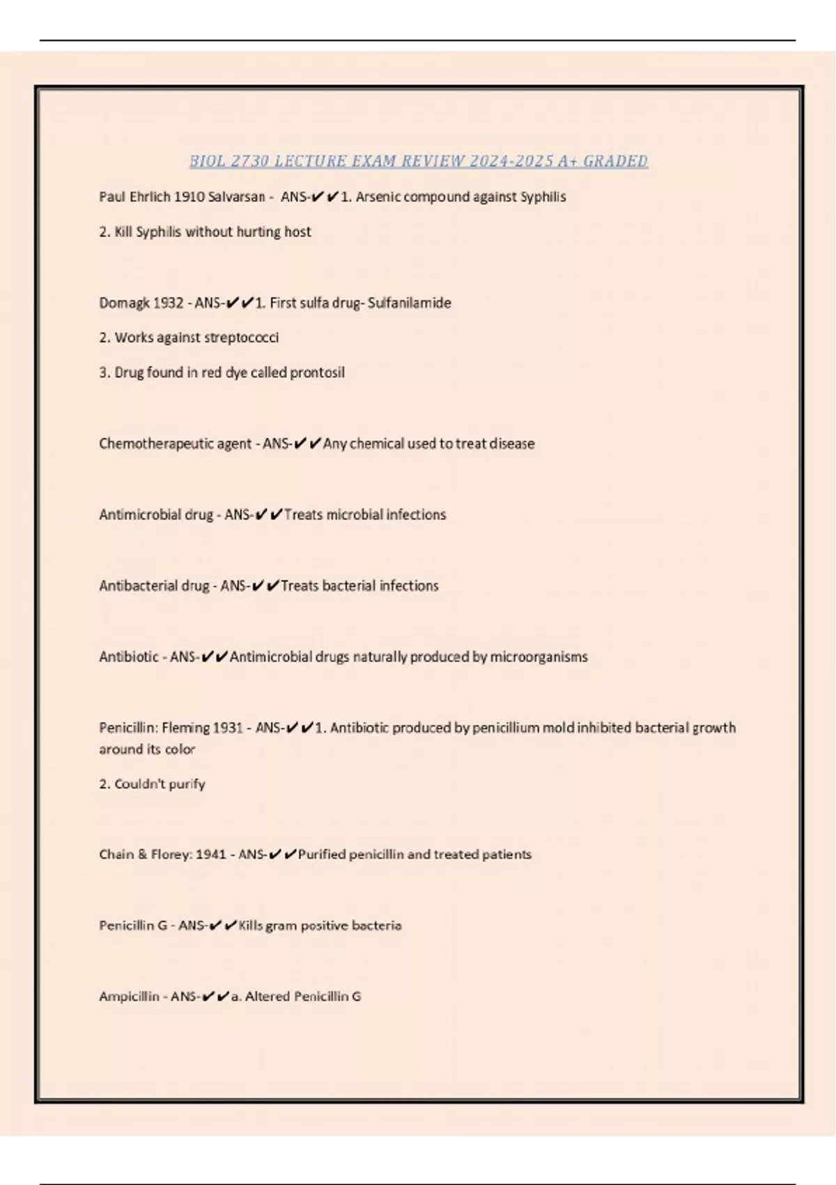 BIOL 2730 LECTURE EXAM REVIEW A+ GRADED Paul Ehrlich 1910 Salvarsan - ANS-1. Arsenic compound against Syphilis 2. Kill Syphilis without hurting host Domagk 1932 - ANS-1. First sulfa drug- Sulfanilamide 2. Works against streptococci 3. Drug found in red dye called prontosil Chemotherapeutic agent - ANS-Any chemical used to treat disease Antimicrobial drug - ANS-Treats microbial infections Antibacterial drug - ANS-Treats bacterial infections Antibiotic - ANS-Antimicrobial drugs naturally produced by microorganisms Penicillin: Fleming 1931 - ANS-1. Antibiotic produced by penicillium mold inhibited bacterial growth around its color 2. Couldn't purify Chain & Florey: 1941 - ANS-Purified penicillin and treated patients Penicillin G - ANS-Kills gram positive bacteria Ampicillin - ANS-a. Altered Penicillin G b. Also kills gram negative bacteria Methicillin - ANS-Altered penicillin to work on penicillin-resistant bacteria that break down penicillin with their enzymes Features of Antimicrobial drugs - ANS-A. Naturally produced antibiotic can be chemically altered after purification to give new characteristics & better stability 1. Some semi-synthetic 2. Some completely synthesized Selective toxicity - ANS-Toxic to microbe but not human host May be toxic in too high a dose Therapeutic index - ANS-Lowest toxic dose to patient divided by typical therapeutic dose Higher therapeutic index - ANS-Less toxic for patient Low therapeutic index - ANS-Monitor blood levels Antibiotics to maintain lower than toxic level in patient Systemically toxic antibiotics used for - ANS-"Topical", skin use Bacteriostatic - ANS-Inhibit or slow down growth to allow host defenses time to work and kill organism Bacteriocidal - ANS-