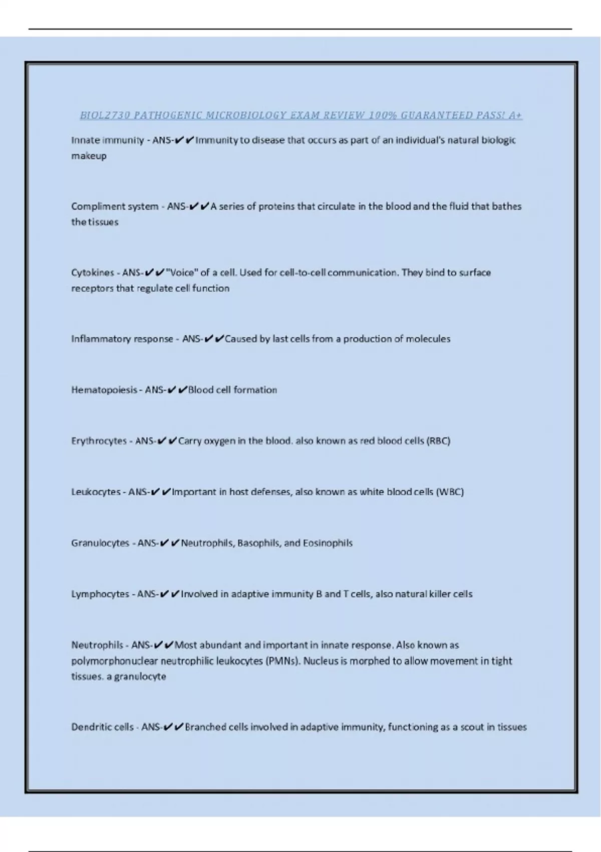 BIOL2730 PATHOGENIC MICROBIOLOGY EXAM REVIEW 100% GUARANTEED PASS! A+ Innate immunity - ANS-Immunity to disease that occurs as part of an individual's natural biologic makeup Compliment system - ANS-A series of proteins that circulate in the blood and the fluid that bathes the tissues Cytokines - ANS-"Voice" of a cell. Used for cell-to-cell communication. They bind to surface receptors that regulate cell function Inflammatory response - ANS-Caused by last cells from a production of molecules Hematopoiesis - ANS-Blood cell formation Erythrocytes - ANS-Carry oxygen in the blood. also known as red blood cells (RBC) Leukocytes - ANS-Important in host defenses, also known as white blood cells (WBC) Granulocytes - ANS-Neutrophils, Basophils, and Eosinophils Lymphocytes - ANS-