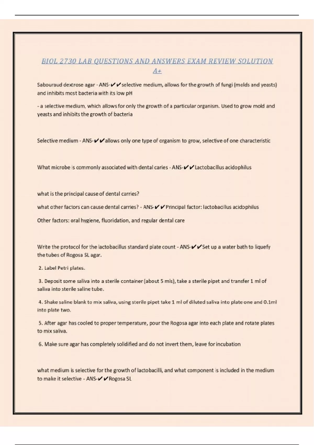 BIOL 2730 LAB QUESTIONS AND ANSWERS EXAM REVIEW SOLUTION A+ Sabouraud dextrose agar - ANS-selective medium, allows for the growth of fungi (molds and yeasts) and inhibits most bacteria with its low pH - a selective medium, which allows for only the growth of a particular organism. Used to grow mold and yeasts and inhibits the growth of bacteria Selective medium - ANS-allows only one type of organism to grow, selective of one characteristic What microbe is commonly associated with dental caries - ANS-Lactobacillus acidophilus what is the principal cause of dental carries? what other factors can cause dental carries? - ANS-Principal factor: lactobacillus acidophilus Other factors: oral hygiene, fluoridation, and regular dental care Write the protocol for the lactobacillus standard plate count - ANS-Set up a water bath to liquefy the tubes of Rogosa SL agar. 2. Label Petri plates. 3. Deposit some saliva into a sterile container (about 5 mls), take a sterile pipet and transfer 1 ml of saliva into sterile saline tube... CONTINUES...