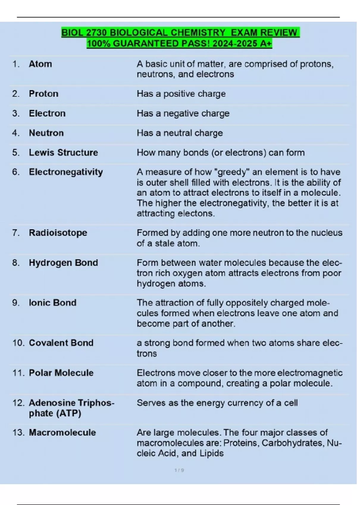 BIOL 2730 BIOLOGICAL CHEMISTRY EXAM REVIEW 100% GUARANTEED PASS! A+ 1 / 9 1. Atom -A basic unit of matter, are comprised of protons, neutrons, and electrons 2. Proton- Has a positive charge 3. Electron -Has a negative charge 4. Neutron -Has a neutral charge CONTINUES...