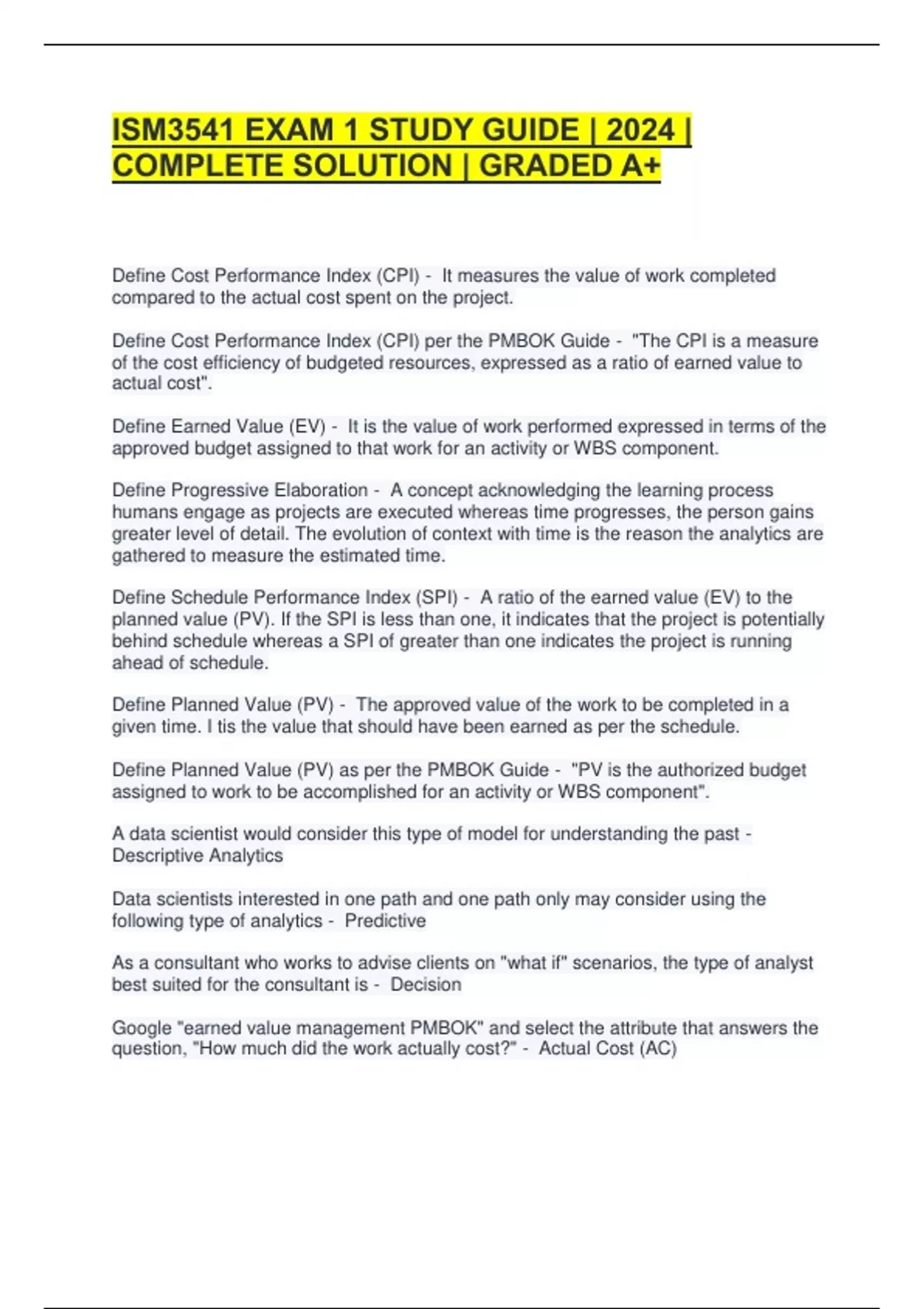 ISM3541 EXAM 1 STUDY GUIDE | 2024 | COMPLETE SOLUTION | GRADED A+ Define Cost Performance Index (CPI) - It measures the value of work completed compared to the actual cost spent on the project. Define Cost Performance Index (CPI) per the PMBOK Guide - "The CPI is a measure of the cost efficiency of budgeted resources, expressed as a ratio of earned value to actual cost". Define Earned Value (EV) - It is the value of work performed expressed in terms of the approved budget assigned to that work for an activity or WBS component. Define Progressive Elaboration - A concept acknowledging the learning process humans engage as projects are executed whereas time progresses, the person gains greater level of detail. The evolution of context with time is the reason the analytics are gathered to measure the estimated time. Define Schedule Performance Index (SPI) - A ratio of the earned value (EV) to the planned value (PV). If the SPI is less than one, it indicates that the project is potentially behind schedule whereas a SPI of greater than one indicates the project is running ahead of schedule. Define Planned Value (PV) - The approved value of the work to be completed in a given time. I tis the value that should have been earned as per the schedule. Define Planned Value (PV) as per the PMBOK Guide - "PV is the authorized budget assigned to work to be accomplished for an activity or WBS component". A data scientist would consider this type of model for understanding the past - Descriptive Analytics Data scientists interested in one path and one path only may consider using the following type of analytics - Predictive