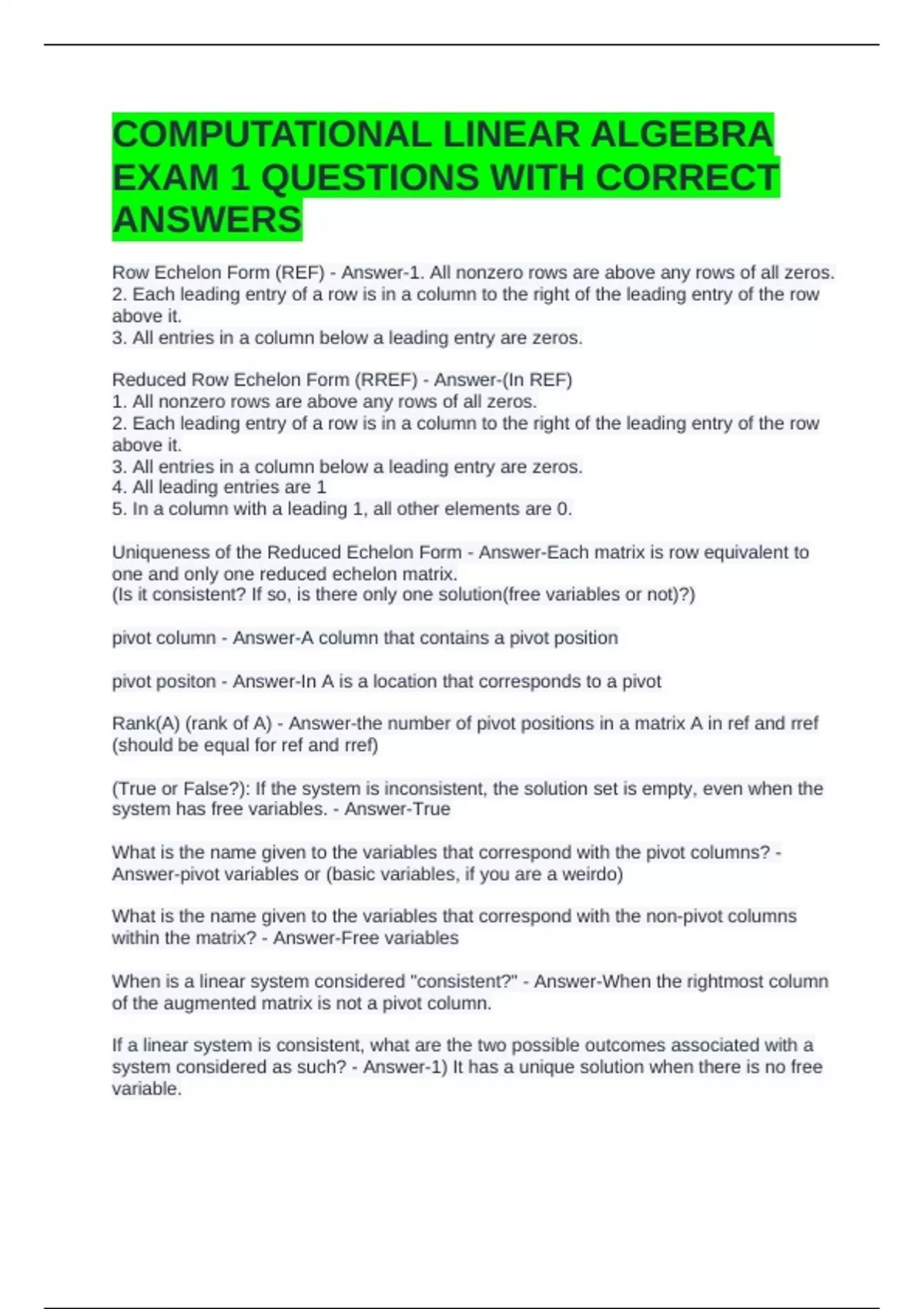 COMPUTATIONAL LINEAR ALGEBRA EXAM 1 QUESTIONS WITH CORRECT ANSWERS
