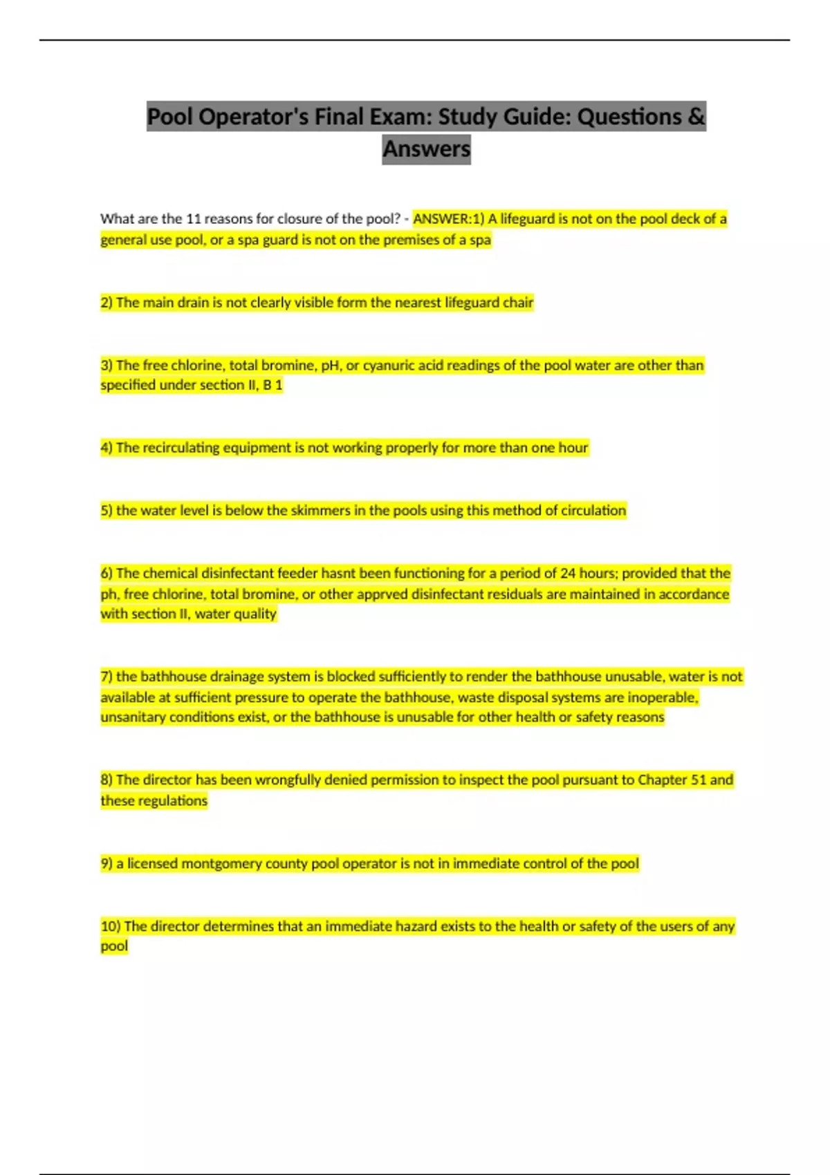 Pool Operator's Final Exam: Study Guide: Questions & Answers