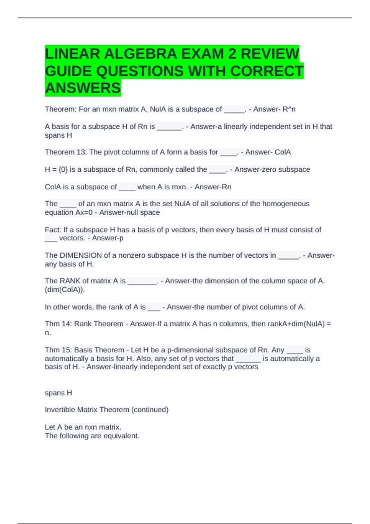 LINEAR ALGEBRA EXAM 2 REVIEW GUIDE QUESTIONS WITH CORRECT ANSWERS
