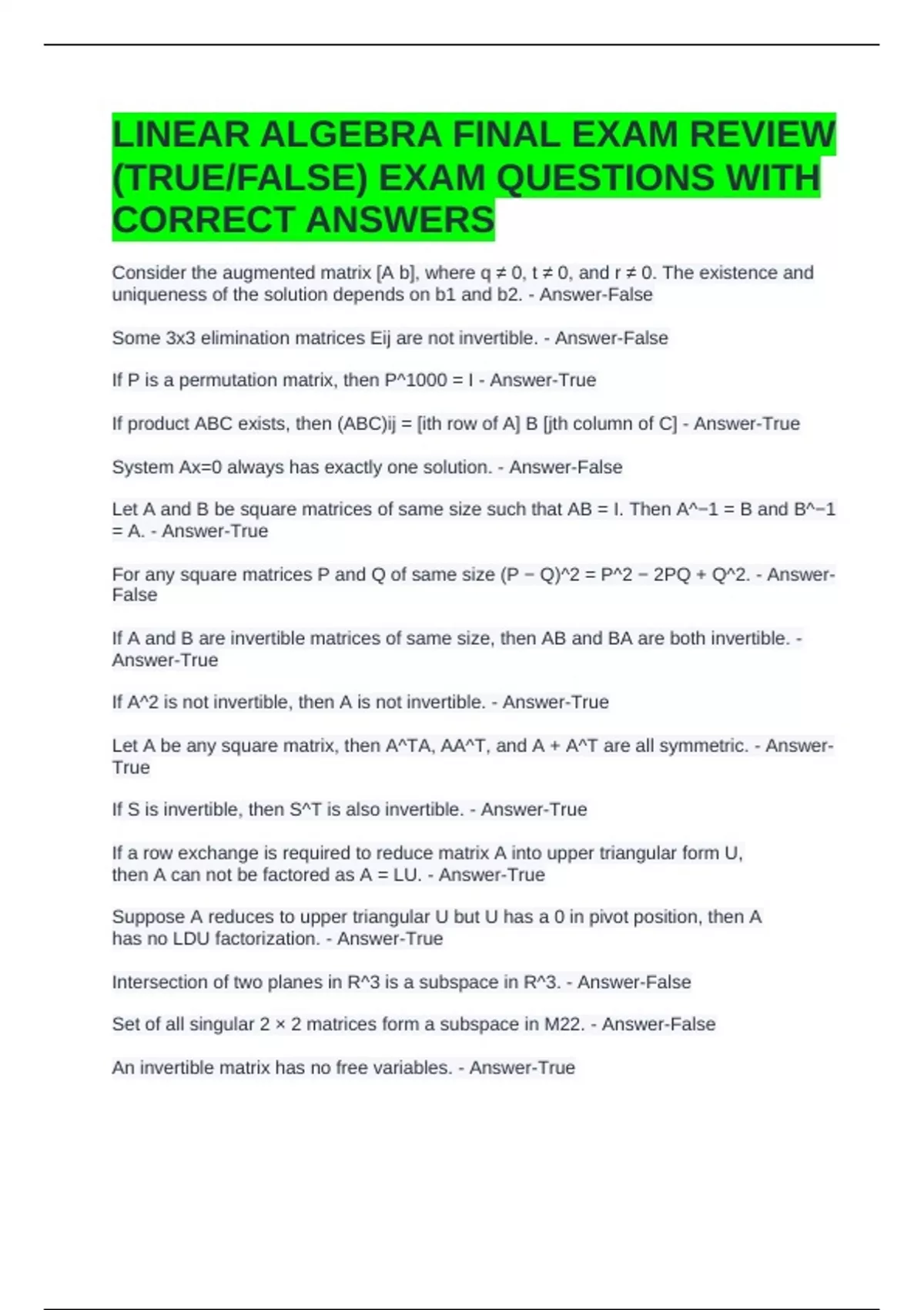 LINEAR ALGEBRA FINAL EXAM REVIEW (TRUE/FALSE) EXAM QUESTIONS WITH CORRECT ANSWERS