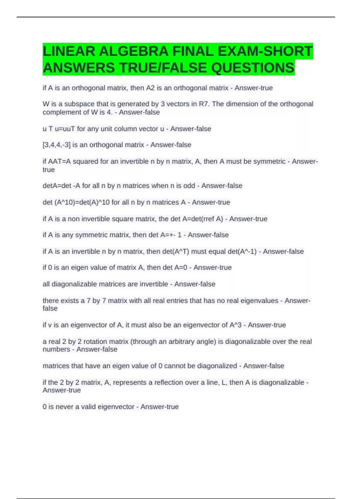 LINEAR ALGEBRA FINAL EXAM-SHORT ANSWERS TRUE/FALSE QUESTIONS