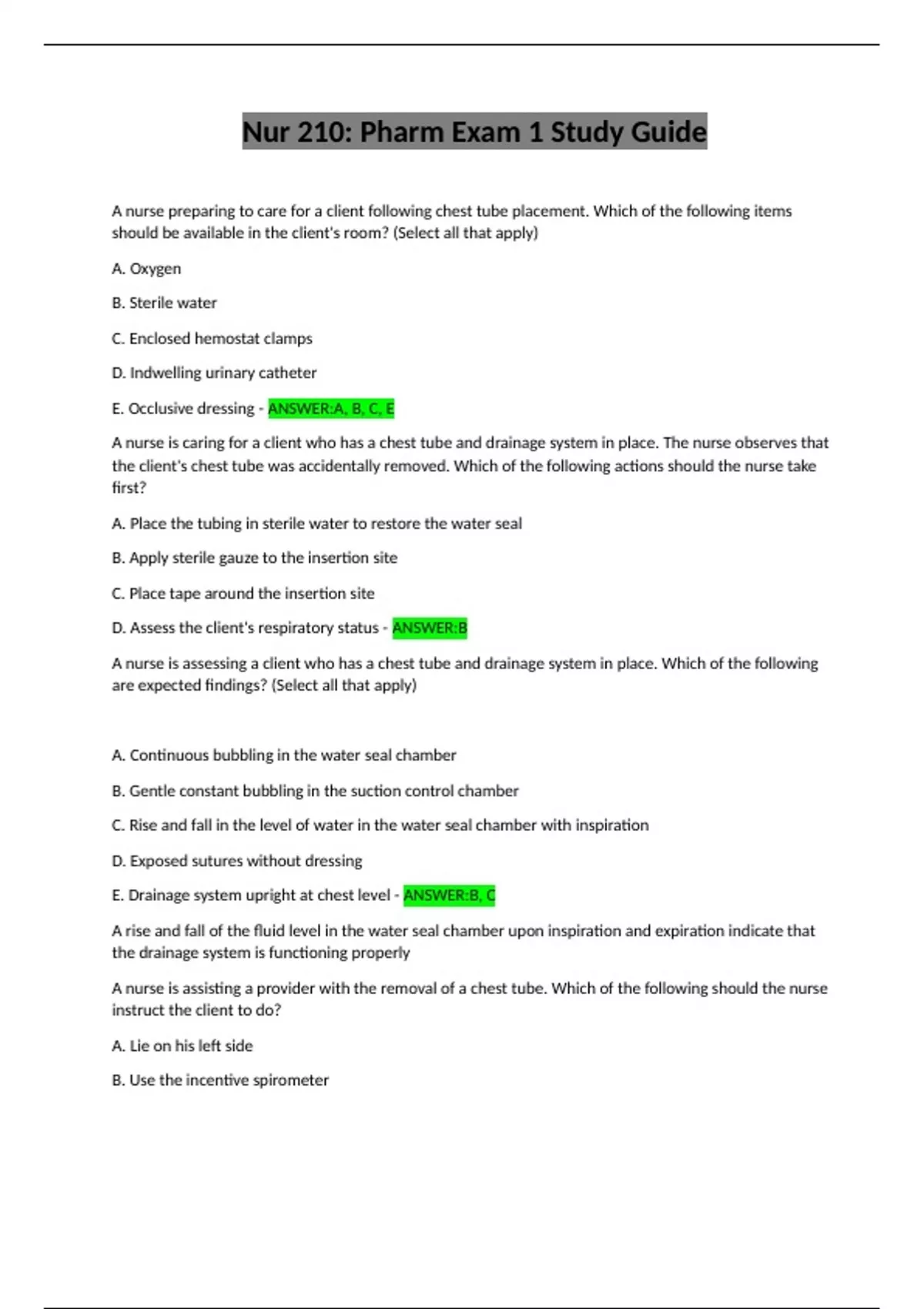 E. Drainage system upright at chest level - ANSWER:B, C