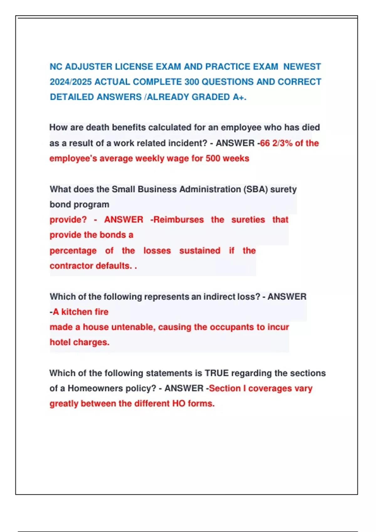 NC ADJUSTER LICENSE EXAM AND PRACTICE EXAM NEWEST 2024/2025 ACTUAL COMPLETE 300 QUESTIONS AND CORRECT DETAILED ANSWERS /ALREADY GRADED A+. NC ADJUSTER LICENSE EXAM AND PRACTICE EXAM NEWEST 2024/2025 ACTUAL COMPLETE 300 QUESTIONS AND CORRECT DETAILED ANSWERS /ALREADY GRADED A+. NC ADJUSTER LICENSE EXAM AND PRACTICE EXAM NEWEST 2024/2025 ACTUAL COMPLETE 300 QUESTIONS AND CORRECT DETAILED ANSWERS /ALREADY GRADED A+. NC ADJUSTER LICENSE EXAM AND PRACTICE EXAM NEWEST 2024/2025 ACTUAL COMPLETE 300 QUESTIONS AND CORRECT DETAILED ANSWERS /ALREADY GRADED A+. NC ADJUSTER LICENSE EXAM AND PRACTICE EXAM NEWEST 2024/2025 ACTUAL COMPLETE 300 QUESTIONS AND CORRECT DETAILED ANSWERS /ALREADY GRADED A+. NC ADJUSTER LICENSE EXAM AND PRACTICE EXAM NEWEST 2024/2025 ACTUAL COMPLETE 300 QUESTIONS AND CORRECT DETAILED ANSWERS /ALREADY GRADED A+. NC ADJUSTER LICENSE EXAM AND PRACTICE EXAM NEWEST 2024/2025 ACTUAL COMPLETE 300 QUESTIONS AND CORRECT DETAILED ANSWERS /ALREADY GRADED A+. NC ADJUSTER LICENSE EXAM AND PRACTICE EXAM NEWEST 2024/2025 ACTUAL COMPLETE 300 QUESTIONS AND CORRECT DETAILED ANSWERS /ALREADY GRADED A+.