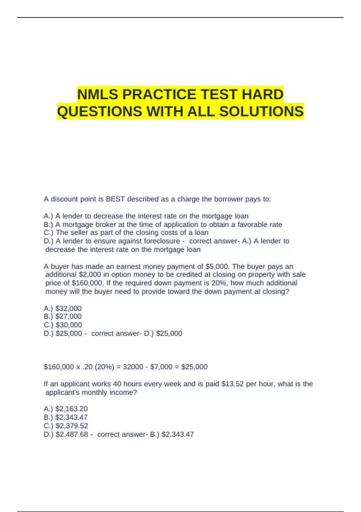 D.) Mortgage broker - correct answer- B.) Lender