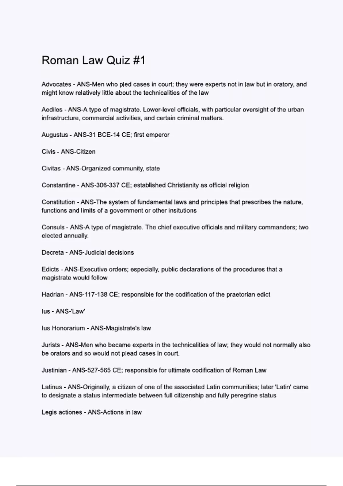 Roman Law Quiz -1 Questions and Correct Answers (100% COMPLETE ANSWERS) ALREADY GRADED A+ | 100% satisfaction guarantee with complete solutions, (Latest update)