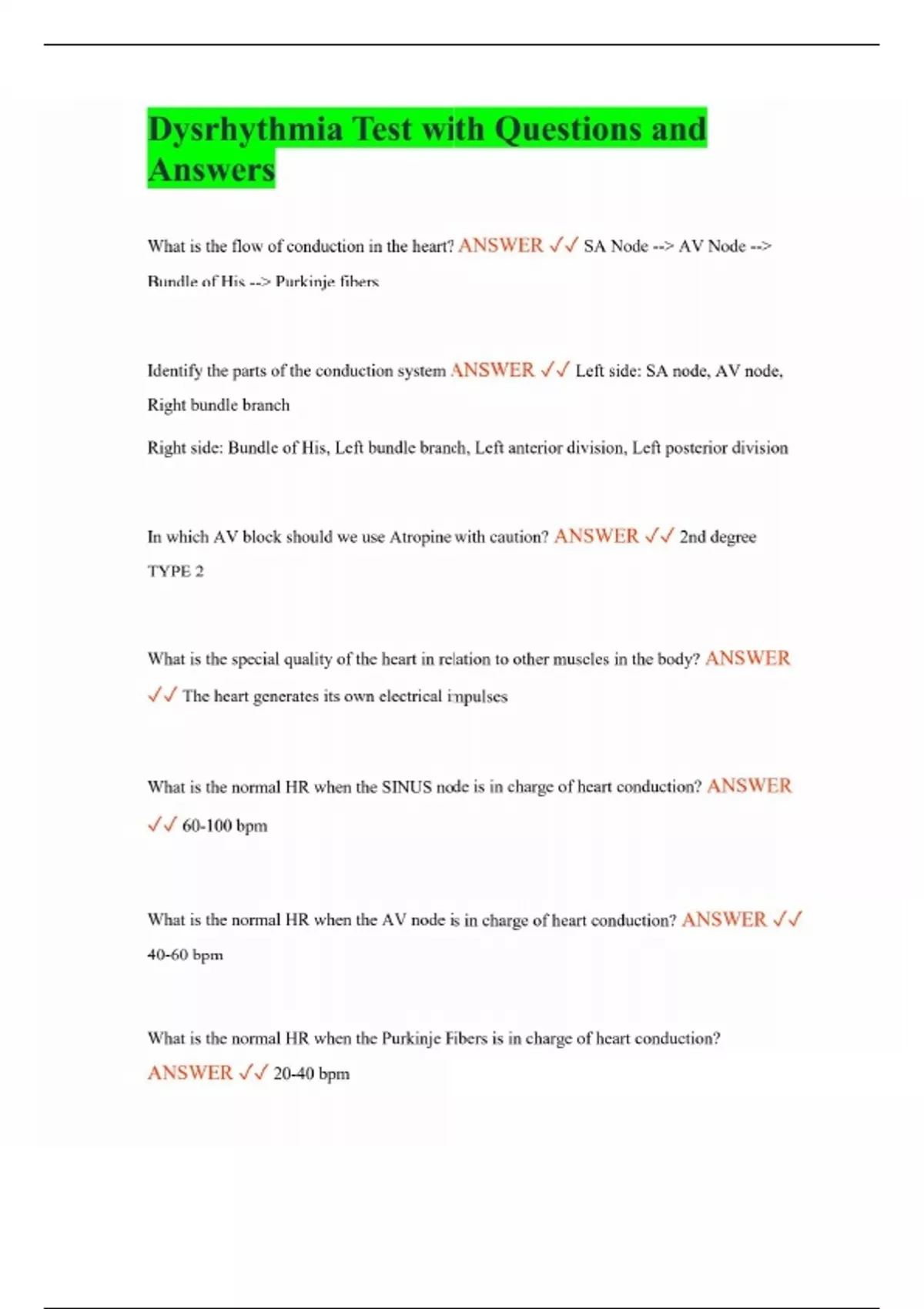 Dysrhythmia Test with Questions and Answers What is the flow of conduction in the heart? ANSWER SA Node --> AV Node --> Bundle of His --> Purkinje fibers Identify the parts of the conduction system ANSWER Left side: SA node, AV node, Right bundle branch Right side: Bundle of His, Left bundle branch, Left anterior division, Left posterior division In which AV block should we use Atropine with caution? ANSWER 2nd degree TYPE 2 What is the special quality of the heart in relation to other muscles in the body? ANSWER The heart generates its own electrical impulses What is the normal HR when the SINUS node is in charge of heart conduction? ANSWER 60-100 bpm What is the normal HR when the AV node is in charge of heart conduction? ANSWER 40-60 bpm What is the normal HR when the Purkinje Fibers is in charge of heart conduction? ANSWER 20-40 bpm What does the P-wave represent? ANSWER Atrial depolarization