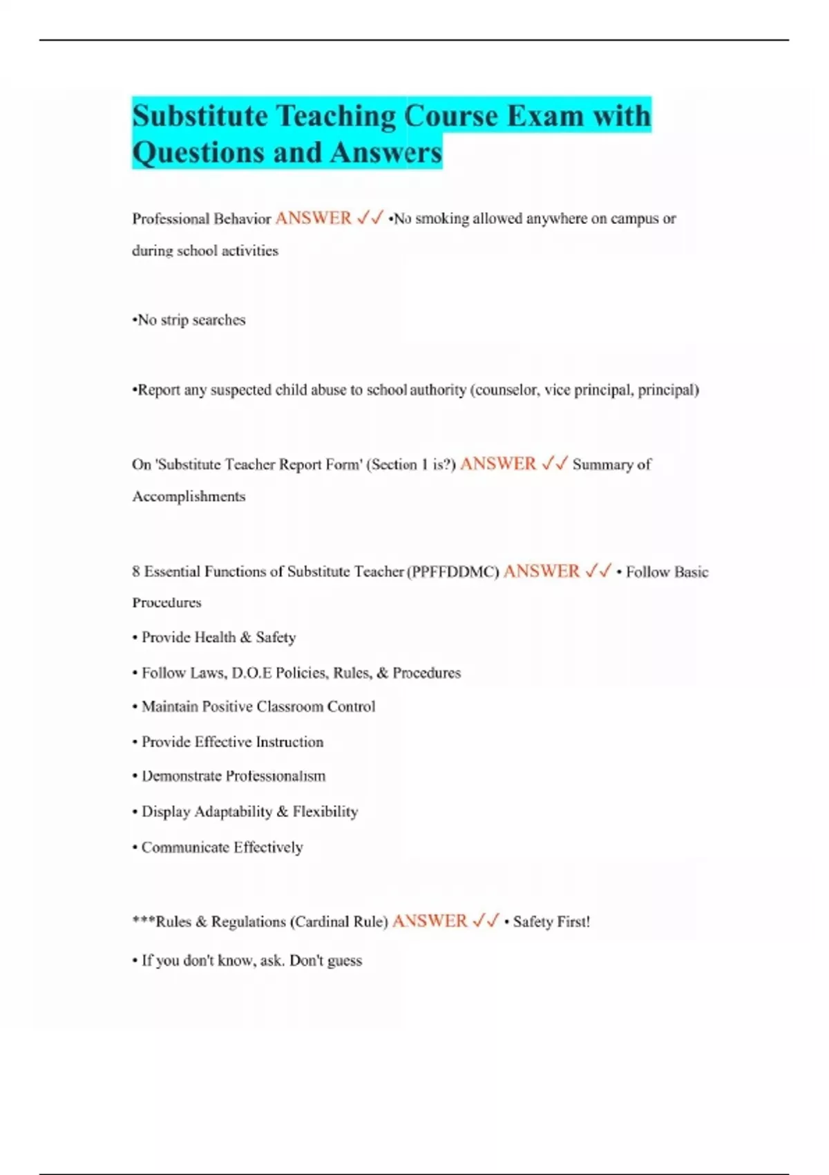 Substitute Teaching Course Exam with Questions and Answers Professional Behavior ANSWER •No smoking allowed anywhere on campus or during school activities •No strip searches •Report any suspected child abuse to school authority (counselor, vice principal, principal) On 'Substitute Teacher Report Form' (Section 1 is?) ANSWER Summary of Accomplishments 8 Essential Functions of Substitute Teacher (PPFFDDMC) ANSWER • Follow Basic Procedures • Provide Health & Safety • Follow Laws, D.O.E Policies, Rules, & Procedures • Maintain Positive Classroom Control • Provide Effective Instruction • Demonstrate Professionalism • Display Adaptability & Flexibility • Communicate Effectively ***Rules & Regulations (Cardinal Rule) ANSWER • Safety First! • If you don't know, ask. Don't guess When to develop & implement lesson plans on long term substitute assign.? ANSWER