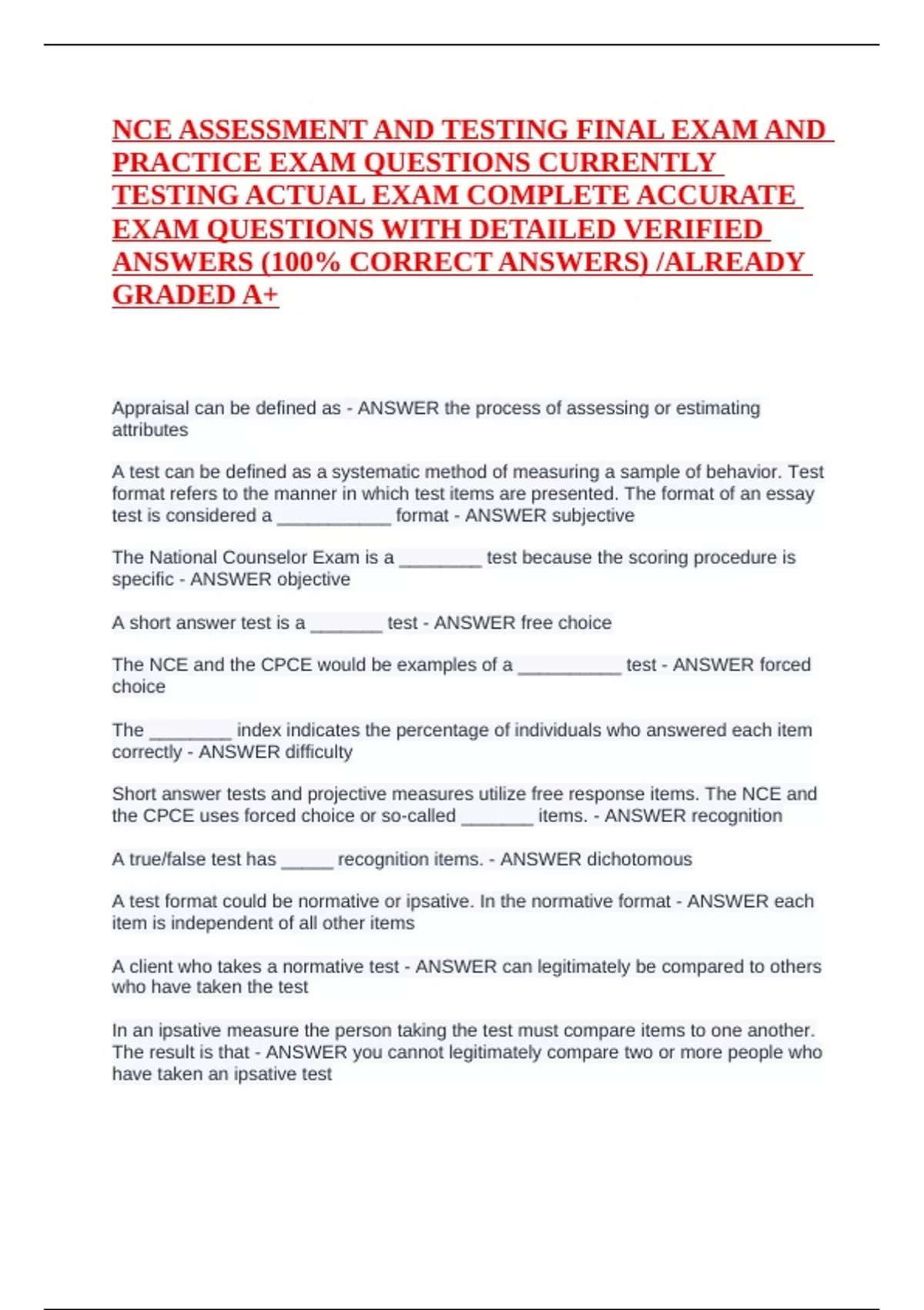 The NCE and the CPCE would be examples of a __________ test - ANSWER forced