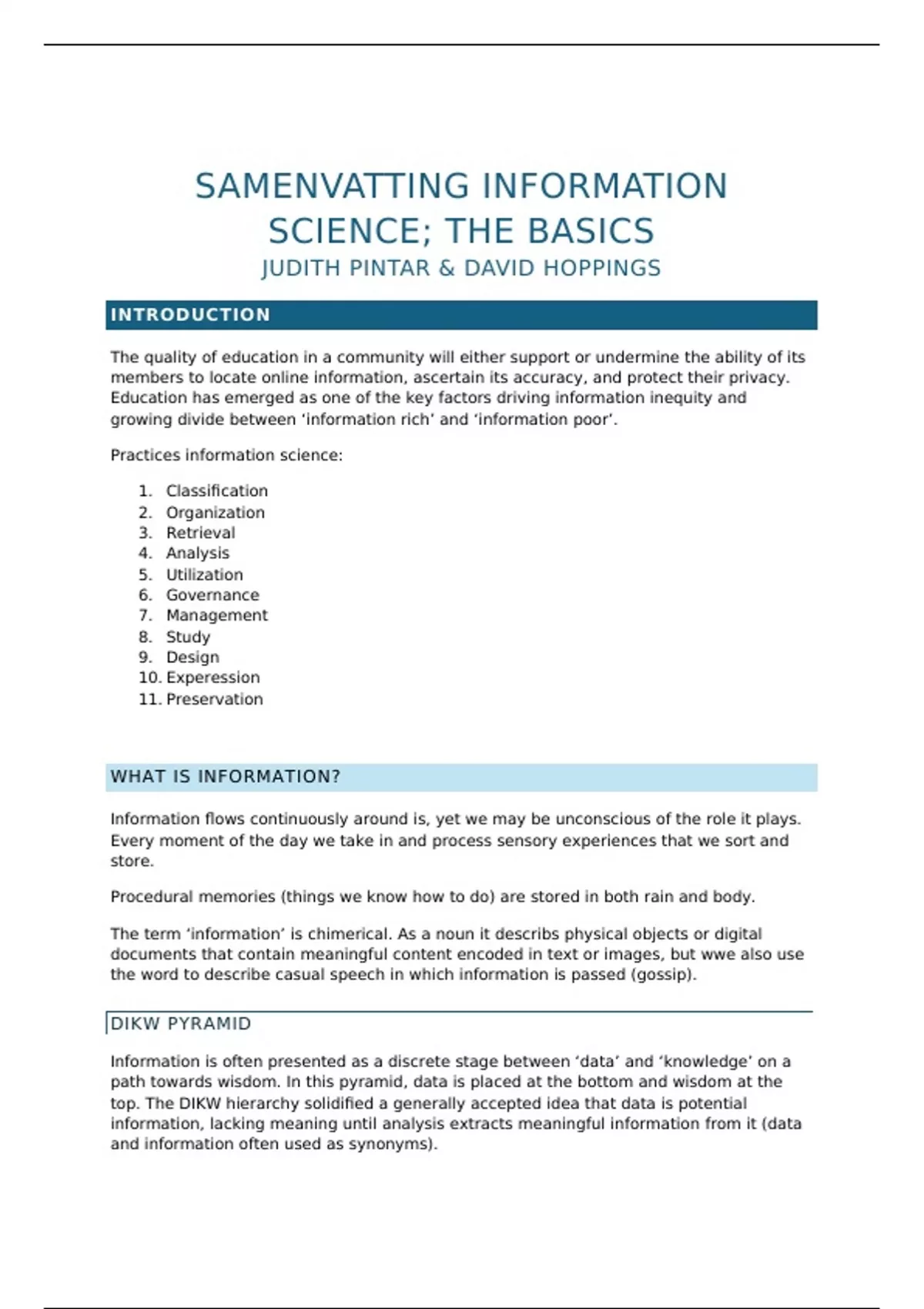 This summary is a very comprehensive summary of all the material needed in the book The Basics: Information Science for the CIW Information Science exam. In addition, I added a brief summary of the accompanying articles (Kline and Haidir & Sundin) and a number of exam questions from last year's powerpoint. 75% of the summary was written in English and 25% in Dutch, because I personally found those chapters more difficult. The summary includes all the terms covered in the lectures and workgroups and has highlighted key figures such as Paul Otlet, Charles Cutter and Julia Pettee.